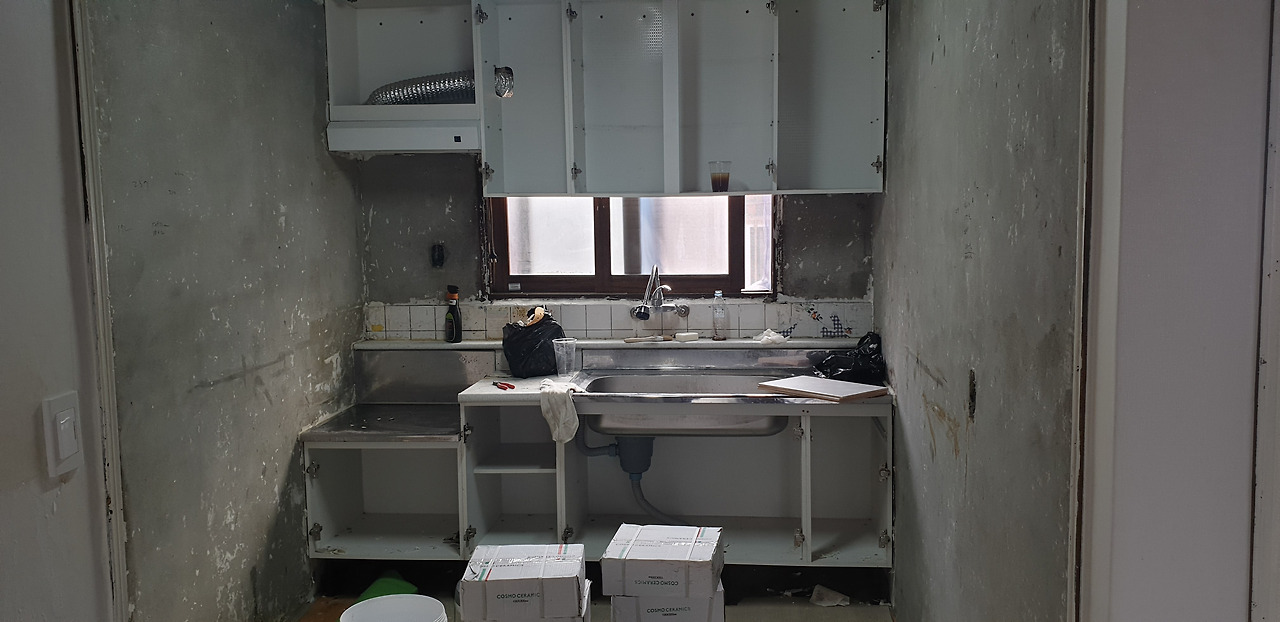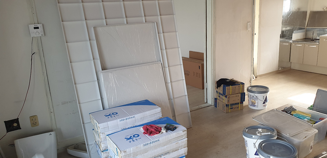 욕실 철거와 제품 나르기가 끝나고 오후에는 주방타일을 시공했습니다.