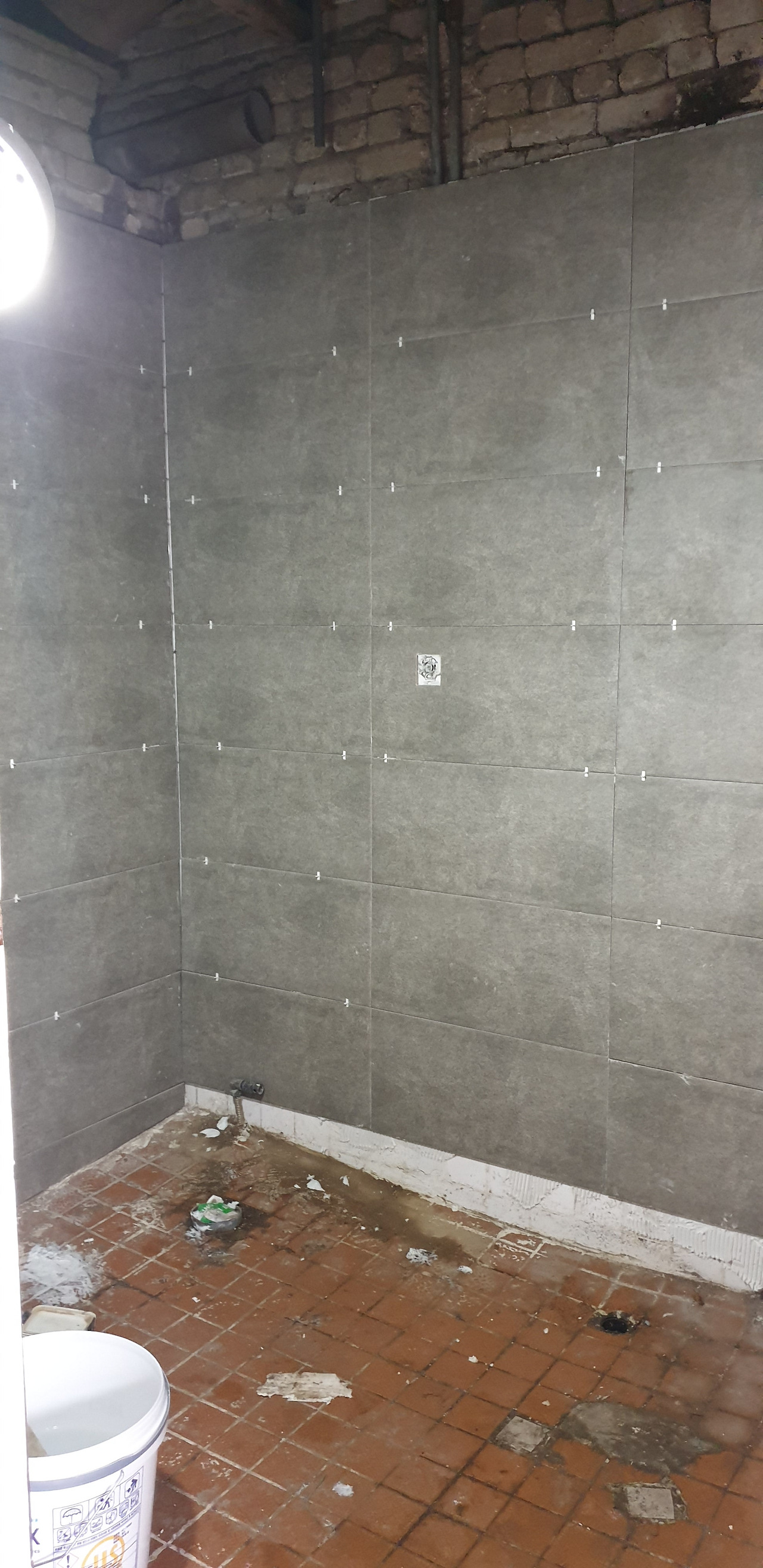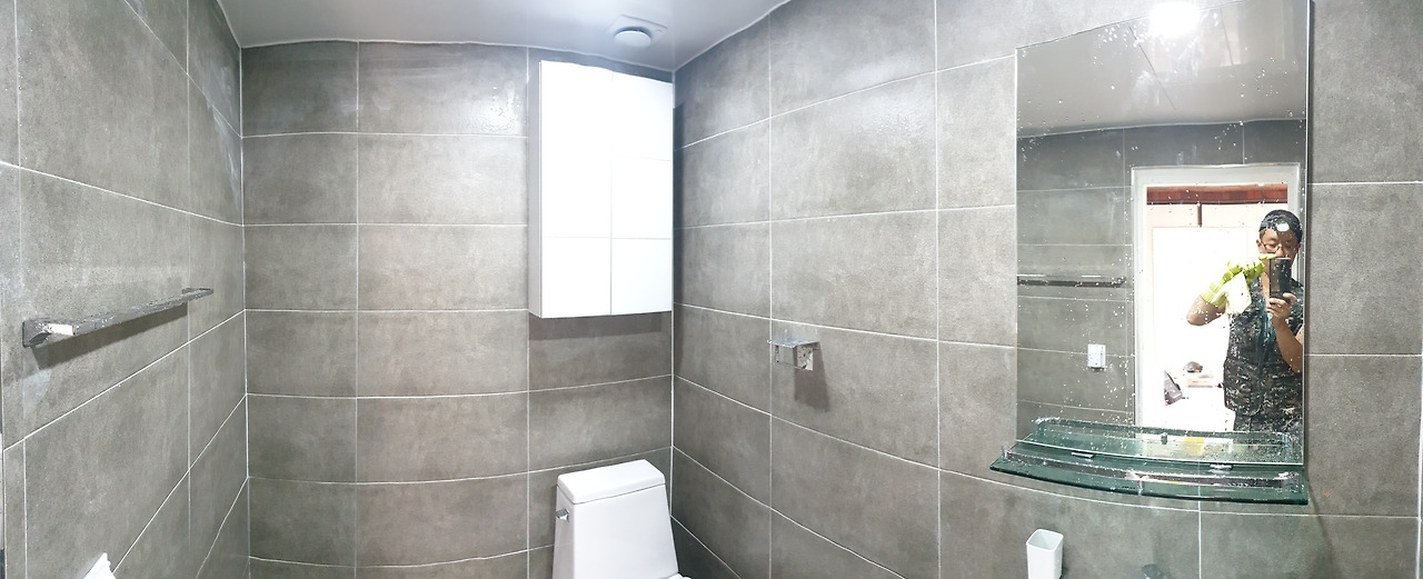 욕실 벽타일 작업 중벽타일 작업 중입니다. 레이저레벨기를 켜고 타일수평을 맞춥니다. 타일스페이스를 모두 꽂아 메지 간격을 동일하게 했어요. 타일에 단차가 조금이라도 나면 때서 다시 붙였고, 함빠(온장이 아닌 잘라 붙이는 타일)도 1mm 이상 틀리면 다시 커팅해 붙였습니다. 시간제한이 없어서 가능한 일이었죠. 작업할 때에는 너무 집중한 나머지 피로감이 느껴지지 않았지만 집 오면 피곤하여 잠자리에 눕자마자 잠들었습니다.