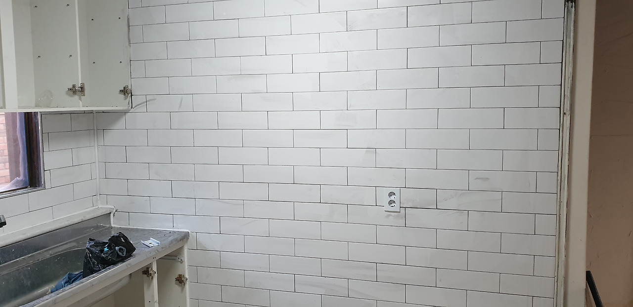 주방타일 시공 후 사진주방타일은 유광 쪽타일(100*300)이고, 메지는 진회색입니다. 이렇게 공사 1일 차가 지나갔어요.