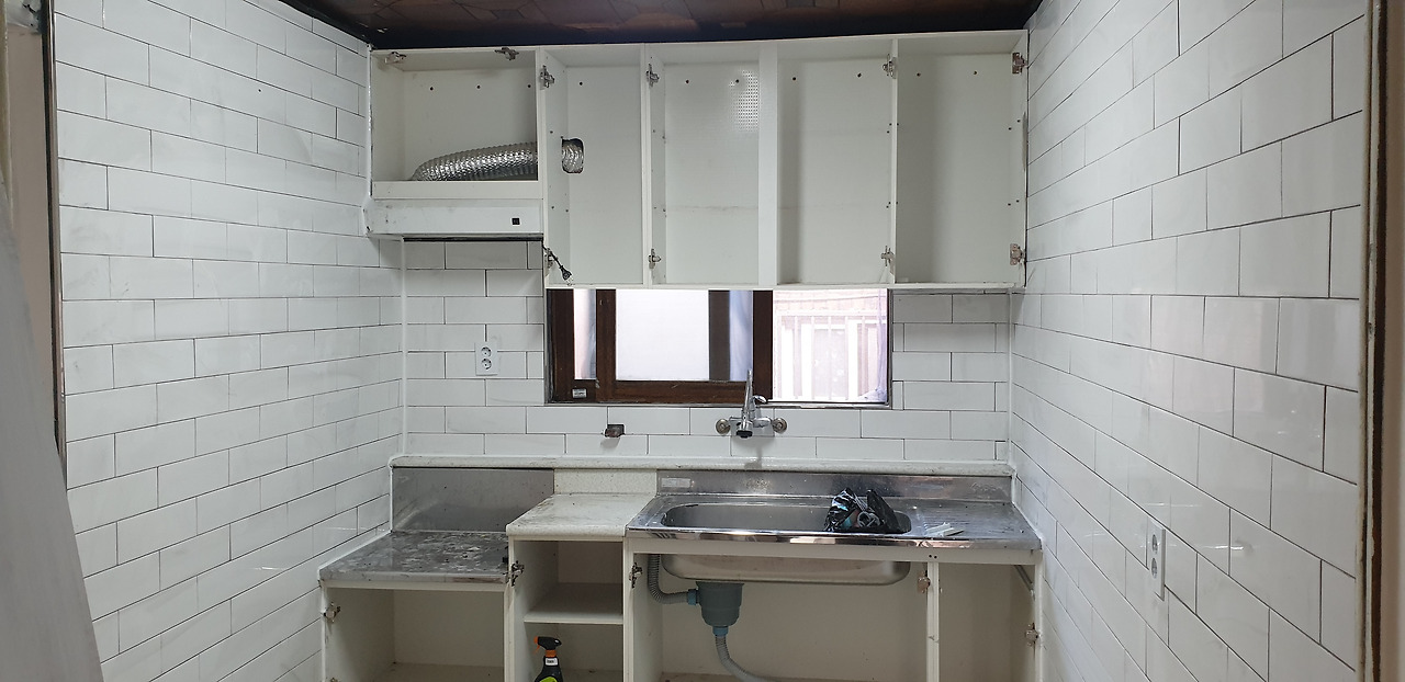 주방타일 시공 전 주방 사진주방도 산만합니다. 물 사용하는 곳은 타일로 마감되어야 하는데 벽지로 마감되어 있었어요. 페인트나 도배로 마감한 곳은 물 쓰고, 요리하면 얼룩이 생기는데 지우기 어렵습니다.