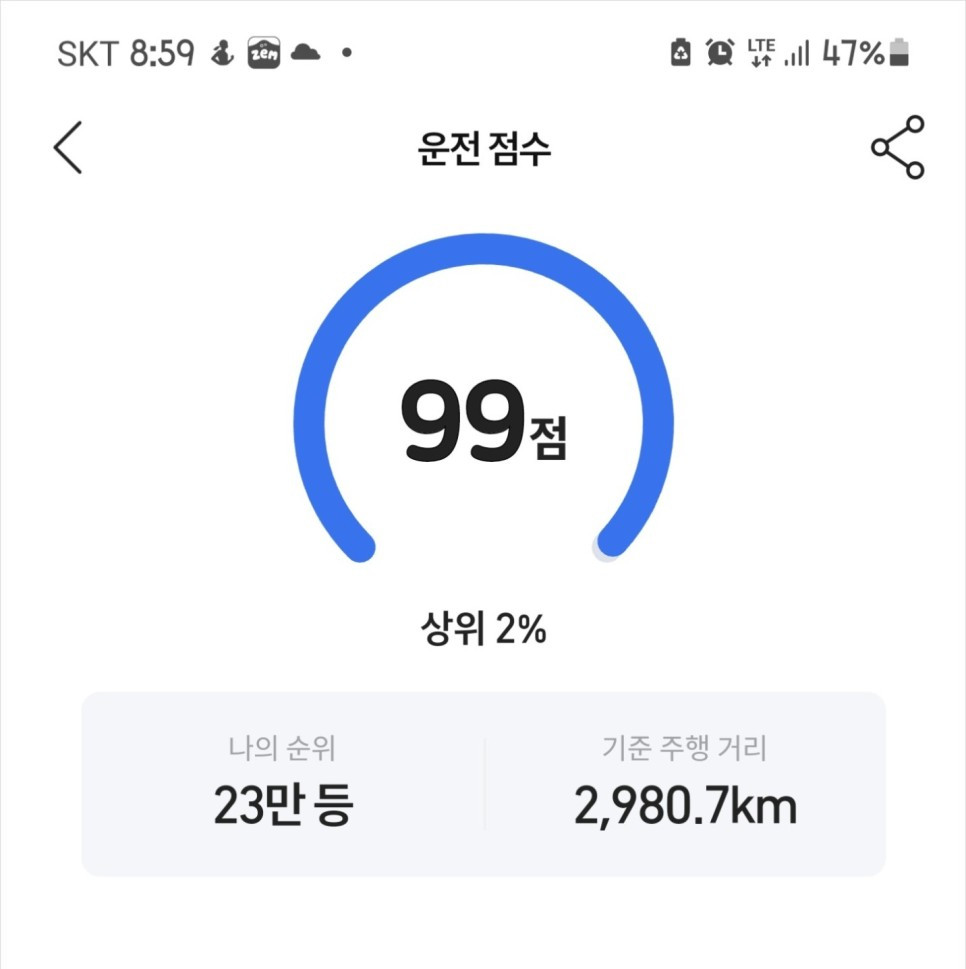 저는 여유를 가지고 안전하게 운전하려고 노력합니다. 내비게이션 티맵으로 목적지를 설정하고 운전하는데, 저의 티맵 안전운전 점수가 상위 2% 네요. 제가 안전하게 운전하는 또 다른 이유는 경제성입니다. 급출발, 급가속, 과속하면 연비가 많이 떨어지거든요. 물론 안전이 제일 중요합니다.
