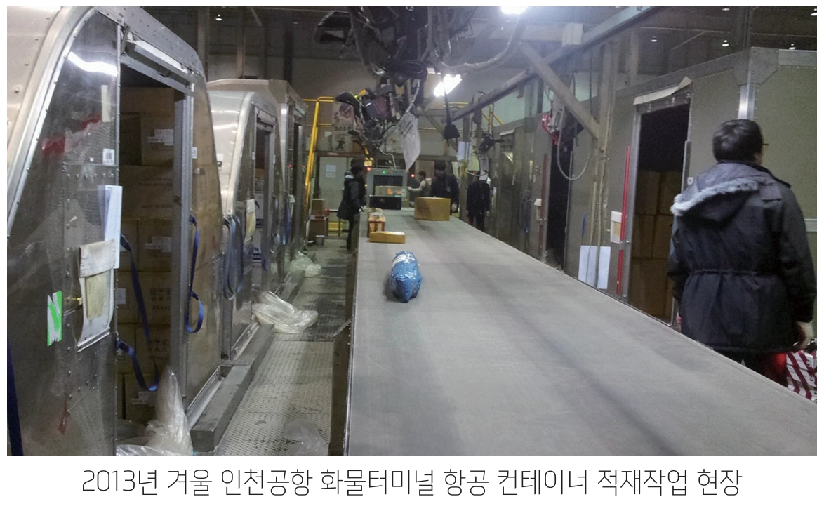 인천공항 화물터미널 창고는 생각했던 것보다 규모가 상당히 큽니다. 그래서 냉난방이 어렵죠. 여름에는 너무 더워 땀을 뻘뻘 흘리며 온몸이 다 젖도록 일하고, 겨울에는 아무리 두꺼운 외투와 작업복을 입어도 춥습니다. 손끝, 발끝이 얼어요. 그곳에서 일을 해본 사람만 알 수 있습니다.