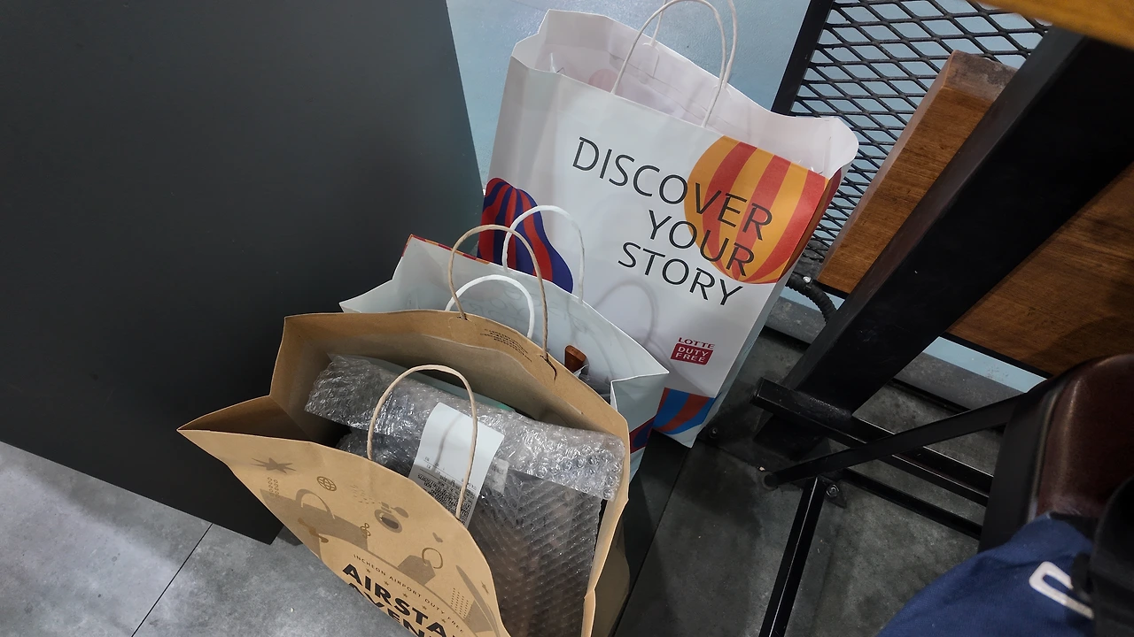 큰 종이가방 세 개에 내 기내 수화물까지 해서,