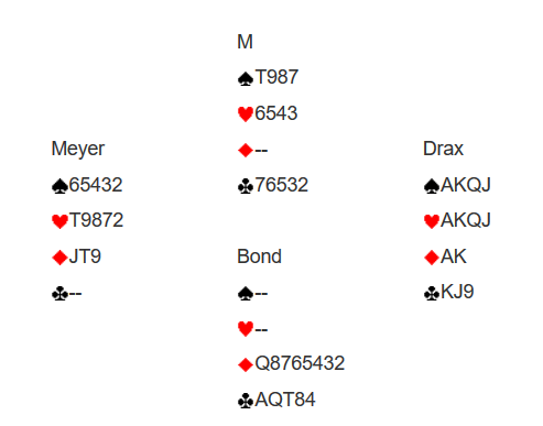 제임스본드의 작가인 이안플레밍도 브리지 게임을 좋아했고 그가 쓴 007 제임스 본드 시리즈 소설 "문레이커"(1979)에도 브리지 장면이 등장한다. 007이 M과 파트너가 되어 악당 드렉스와 브리지게임을 하게 되는데 단순한 오락을 넘어 두 사람의 지적 대결과 심리전을 상징하는 중요한 장면이다. 마지막 게임에 등장하는 핸드는 19세기부터 내려오는 전설적인 핸드를 변형한 것으로 본드가 드렉스의 속임수를 간파하고 역이용하여 7♣의 그랜드슬램 컨트렉트를 만들어내는 데 성공하고 승리하는데 그 핸드는 아래와 같다.
