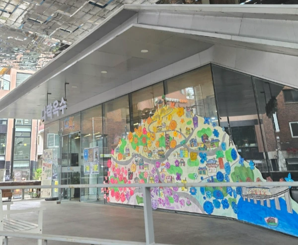 다락 옥수 밖에는 우리 동네 그림이 예쁘게 그려져 있었는데 수업에 들어가느라 세세하게 볼지 못했는데 다음 방문시에는 그림도 더 가까이서 보고 우리 집도 찾아보려 합니다.
