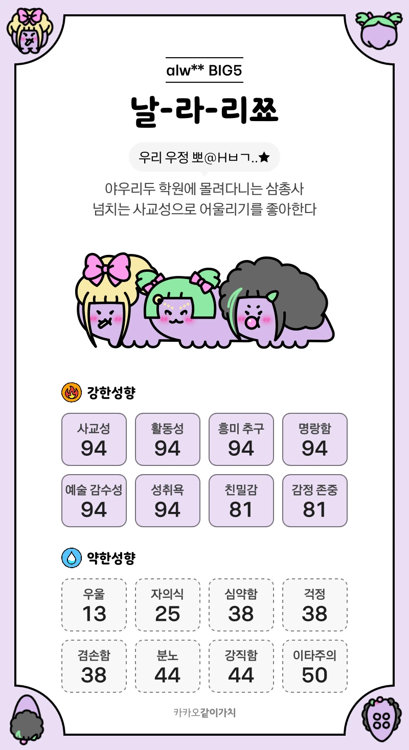‘나’라는 사람을 알게 하는 대화는 흔치 않다. 모든 대화가 나를 포함하지만 내 성격과 기질에 대해, 나는 어떤 사람이고 어떤 삶을 살아왔는지를 이야기해 주는 사람들은 참 귀하다. 오늘 귀한 경험해서 좀 많이 신나는 날. 만나서 쉴새 없이 이야기하다 브런치를 다 먹고 추천받은 검사 하면서 언니들은 똑같은 유형이 나왔고 나는 생전 처음 본다는 유형이 나왔다. 그조차 너무 재미난! 같이를 중요시하는 나, 오늘 이야기를 들으면서 느낀 나라는 사람은 내가 1번인 것 같은데 사람들과의 주변 관계도 영향을 받고 중요시 여기면서 거기다가 발발거리고 다니면서 사회적인 관계까지 지향하는 사람이라는걸 느끼고 혼란스러웠다. 모두가 저런 성향이 없지는 않은데 나의 모습 하나 하나를 내가 크게 생각해서 나라는 사람을 못보고 있는건 아닌가. 그래더 더 찾아보기로 했다. 내가 어떤 사람인지! 일단 나는 나도 좋아하고 사람도 좋아하고 공동체도 좋아해! 이게 왜! 난 다 좋아! 다 할래!