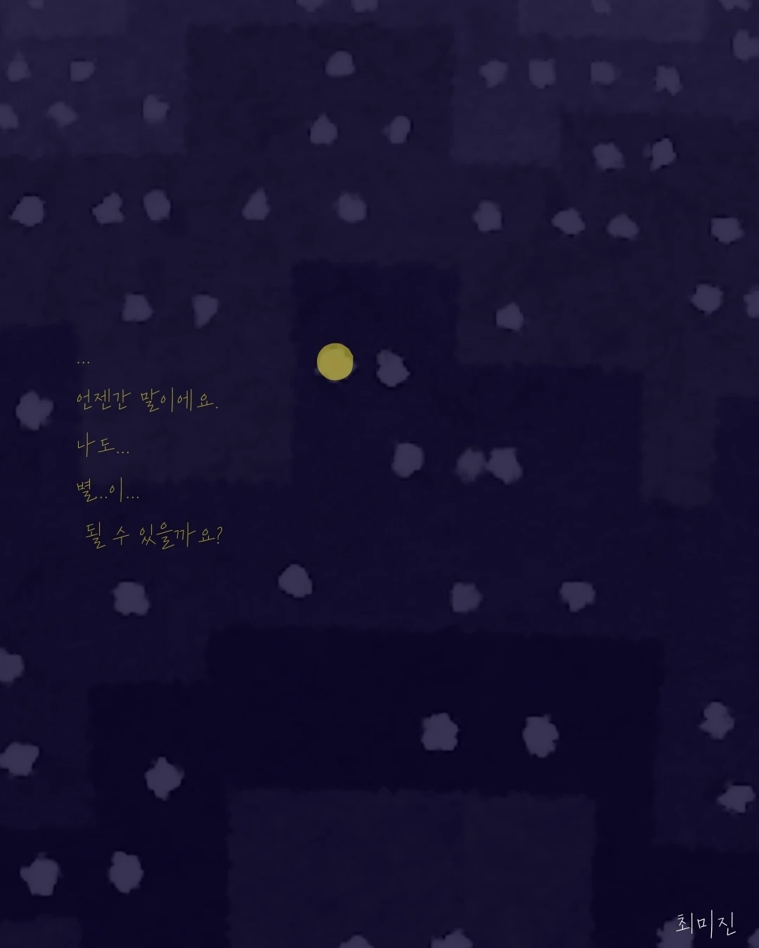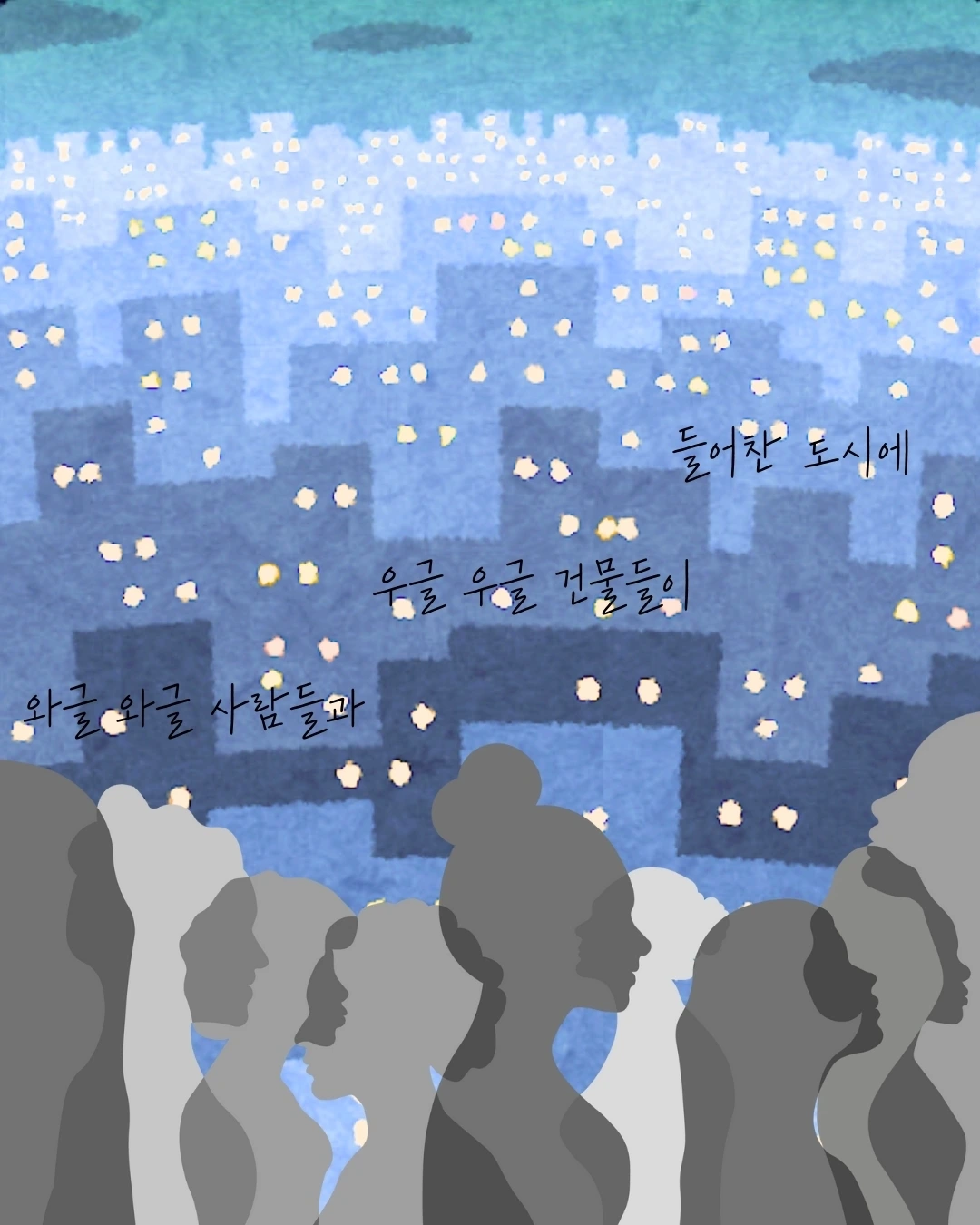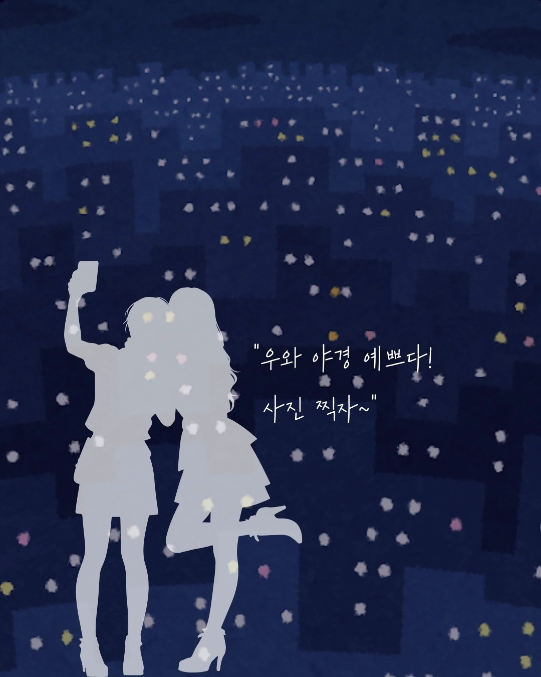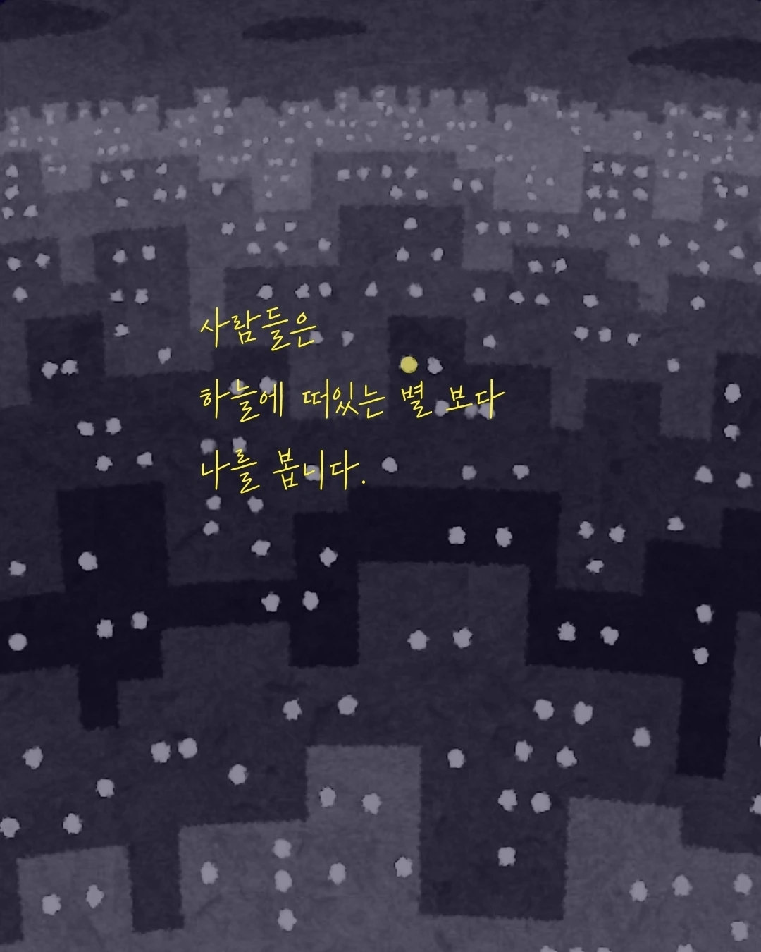 도시하면 반짝하는 불빛이 떠오릅니다. 시골로 갈수록 원초적인 깜깜한 하늘과 별을 더 잘 만날 수 있는 반면, 도시에서는 불빛이 별빛이자 사람들을 안내하는 가이드가 됩니다. 밤늦게까지도 반짝 번쩍거리는 도시의 불빛은 별을 보며 어떤 생각을 하고 어떤 마음을 가질까요? 별빛이 되고 싶을지도 모르는 도시의 불빛은 어떤 이야기를 전해줄까요? 불빛 자신의 존재를 확인시키는 도시에서의 생활을 그려봅니다.