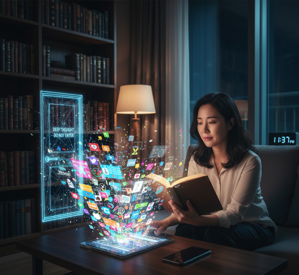 디지털 환경은 우리의 집중 시간을 산산이 쪼갠다. 뉴욕대학교 애덤 알터(Adam Alter)의 디지털 중독 연구에 따르면, 현대인의 평균 집중 지속 시간은 47초에 불과하다. 스마트폰 알림, 짧은 영상, 빠른 피드백, 알고리즘…. 이 모든 환경은 우리의 사고가 짧은 단위로 끊기도록 설계되어 있다. 이에 익숙해진 뇌는 긴 흐름을 따라가는 것을 어려워한다. 반면 책 읽기는 길고 지속적인 호흡을 요구한다. 독서하지 않는 것이 아니라, 독서가 요구하는 집중의 리듬을 유지할 수 없게 된 것이다. 따라서 우리는 시간이 없어서가 아니라, 주의력이 파편화(fragmented)되었기 때문에 책을 읽기 어려운 것이다. 내 의지의 문제만은 아니다.