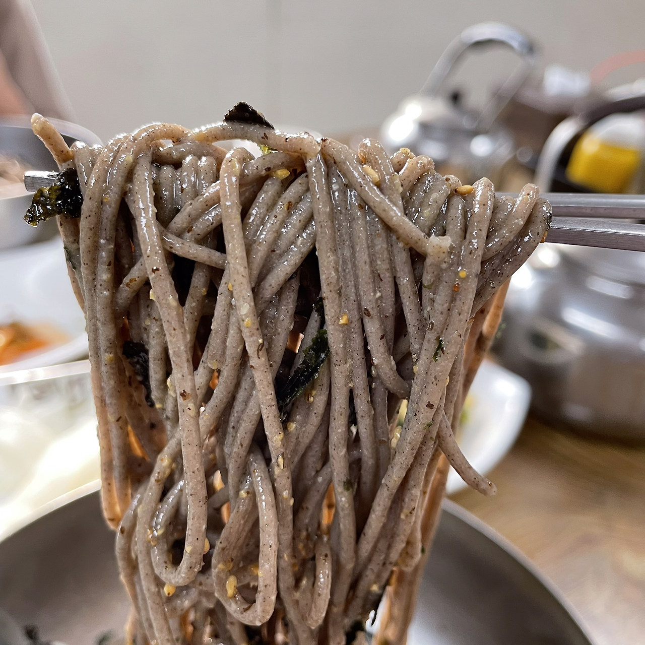 마지막으로 오늘의 주인공인 토면을 맛보았다. 한 그릇만 주문하였는데 사장님께서 센스 있게 그릇 두 개에 사리를 반반 나눠 각자 취향으로 토면을 잘 즐길 수 있게 신경 써 주셔 감사했다. 먹는 방법 또한 친절히 설명해 주셨는데, 간장이 짤 수 있으니 처음부터 많이 넣지 말고 조금씩 먹어보며 양념하라고 하셨다. 양념장은 식초, 겨자, 다대기, 간장, 설탕이 있었다. 우리는 당연히 아무것도 넣지 않은 오로지 토면 그 자체를 먼저 맛보았다. 약간 텁텁하고 쉽게 툭툭 끊어 지는 면발이 입안에서 씹으면 씹을수록 고소한 풍미가 구수하게 전해졌고 메밀향이 은은하게 느껴졌다. 거기다가 살짝살짝 씹히는 메밀껍질이 투박했지만 메밀의 풍미를 완성시켰다. 본래 메밀 고유의 맛을 즐기러 왔기 때문에 아무 양념을 하고 싶지 않았지만 도시적인 현실에 순응이라도 하듯 양념을 기호껏 첨가해서 먹어보았다. 푸석한 식감에 액체가 약간씩 첨가되니 윤활 효과가 생겨 먹기에는 더 편했다. 간 또한 기호에 맞추었기 때문에 아무 생각 없이 후루룩 넘어갈 정도로 친근한 맛이 되었다. 아이러니하였다. 태생으로부터 원초적인 자연의 맛은 점점 어색해져 가는 반면, 미래에서부터 다가오는 도시적이고 인공적인 맛에 친근해져 가는 현대인의 모습에 안타까움을 느낀다.