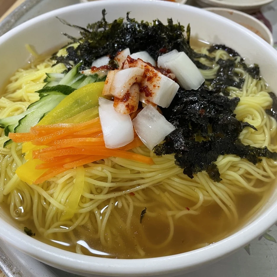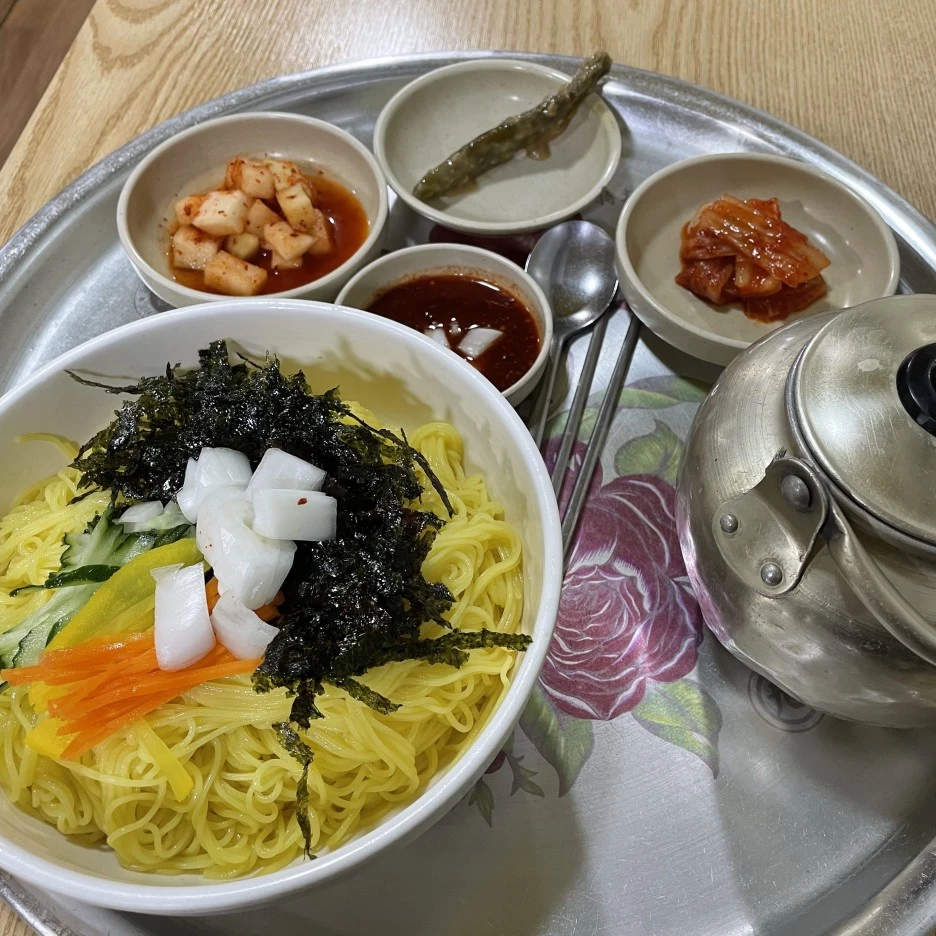정겨운 쟁반에 잔치국수와 육수가 담긴 주전자, 반찬, 그리고 수저까지 한꺼번에 나오니 마치 새참을 받는 기분이 들었다. 반찬은 김치와 깍두기, 푹 익은 된장고추장아찌가 나왔다. 하나씩 맛보니 전반적으로 맛이 달짝지근했다. 특히 깍두기는 많이 달았는데 잔치국수의 다소 밋밋할 수 있는 맛을 보완하기 위해서 그런 것 같았다. 배추김치와 고추장아찌는 특별한 맛은 없고 무난한 맛깔스러운 맛이었다. 잔치국수 고명으로는 생으로 채소들이 올라가 있었다. 오이와 단무지, 당근, 김가루 그리고 양파가 엄지손톱만 한 크기로 특이하게 썰어져 나왔다. 당근 정도는 살짝 볶아 나오는 집도 있다. 고명은 조리하지 않은 생생한 재료 그대로여야 육수의 맛에 크게 영향을 미치지 않는다는 이 집의 국수에 대한 철학이 아닐까 싶다.