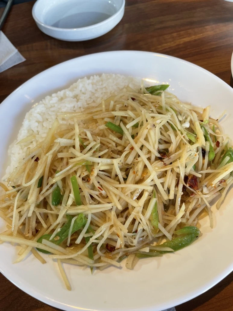 다음으로 새콤매콤 감자채를 맛 보았다. 요리 이름이 맛을 정직하게 설명해주었다. 새콤하고 달콤했다;. 추가로 매콤한 맛도 있었다. 감자채가 한국에서 흔히 반찬으로 먹는 것과는 다르게 아주 얇게 채 썰어져 있었다. 한국의 감자채는 부드럽게 푹 익어야 잘 만들었다는 칭찬을 받는데 비해 중국식 감자채는 완전히 푹 익히진 않았다. 약간 덜 익은 감자채는 약간 아삭한 식감이었고 감자의 신선함을 느낄 수 있었다. 이렇게 약간 아삭한 식감 덕분인지 전반적으로 감자채가 상큼하게 느껴졌다. 새콤한 맛은 일반적으로 사용하는 사과식초와는 확연히 다른 향이 새콤한맛으로 표현되었다. 한국의 감자채에서 느껴보지 못한 맛과 향들을 즐길 수 있어서 또다른 의미로 신선함을 느꼈다. 가정식으로 정말 부담 없이 가볍고 맛있게 즐길 수 있는 음식이었다.