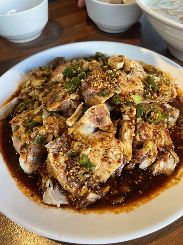 메인 요리 격으로 나온 이름도 생소한 여름 계절특선 음식이 나왔다. 겉으로 보기에도 차가워 보이는 닭은 뼈째 거칠게 토막이 나서 매콤한 간장소스에 충분히 적셔 나왔다. 난생 처음 먹어보는 맛이었는데 그런 음식 치곤 거부감은 크게 없었다. 오히려 퍽퍽하면서 무던한 순백의 닭고기에 강한 양념이 적절하게 조화를 이루어 젓가락이 쉴틈없이 계속 가는 맛이었다. 주의할 점은 뼈째 거칠게 칼로 토막내어 나오기 때문에 날카로운 뼈들이 있어 천천히 조심해서 먹어야 했다. 붉은 기를 띄고 있는 간장소스는 우리가 흔히 만두를 먹을때 같이 곁들이는 식초와 고추가루가 첨가된 간장의 맛과 매우 유사하였다. 간장에 고춧가루와 식초를 적절히 섞은데다가 고추기름을 첨가한 듯하였다. 거기다 송송 썬 청양고추 고명이 매운맛을 배가시켰고 깨가 그 매운맛을 잡으려고 고군분투하는 느낌이 들었다. 복숭아씨는 이 음식이 입맛에 맞지 않아 많이 드시진 않았고 혼자먹기 많은 양이어서 음식이 남으면 포장해갈 생각이었는데 내 입맛에는 잘 맞아 남기지 않고 다 먹었다. 글을 쓰면서도 생각이 나면 군침이 고이는 개인취향을 저격한 음식이었다.