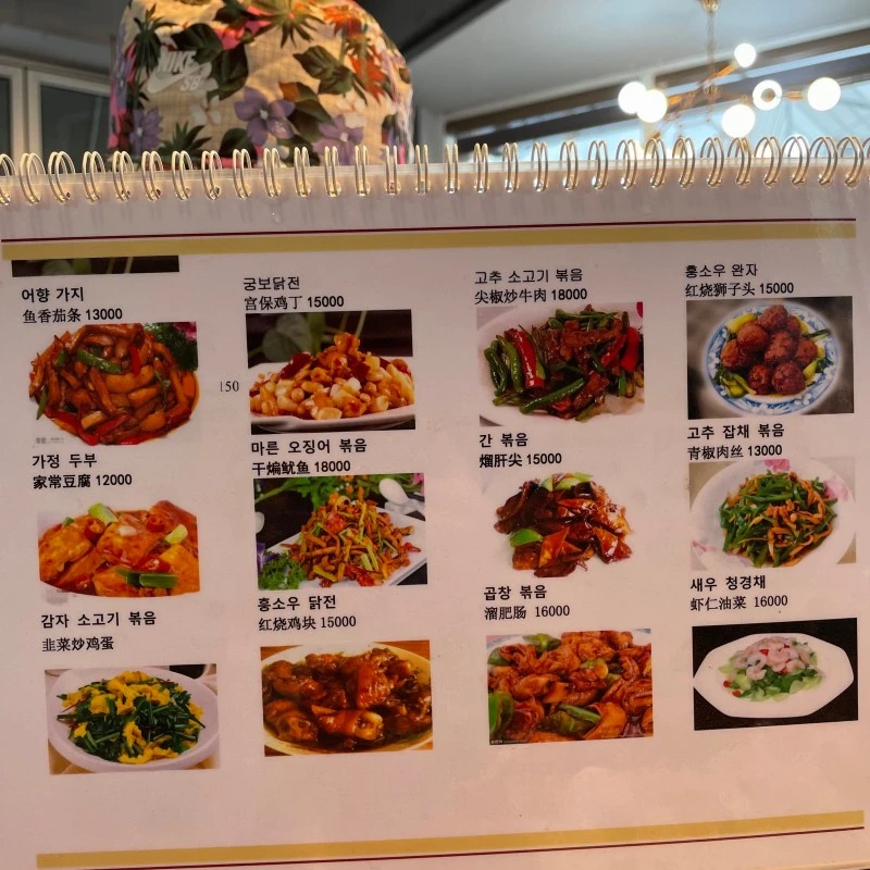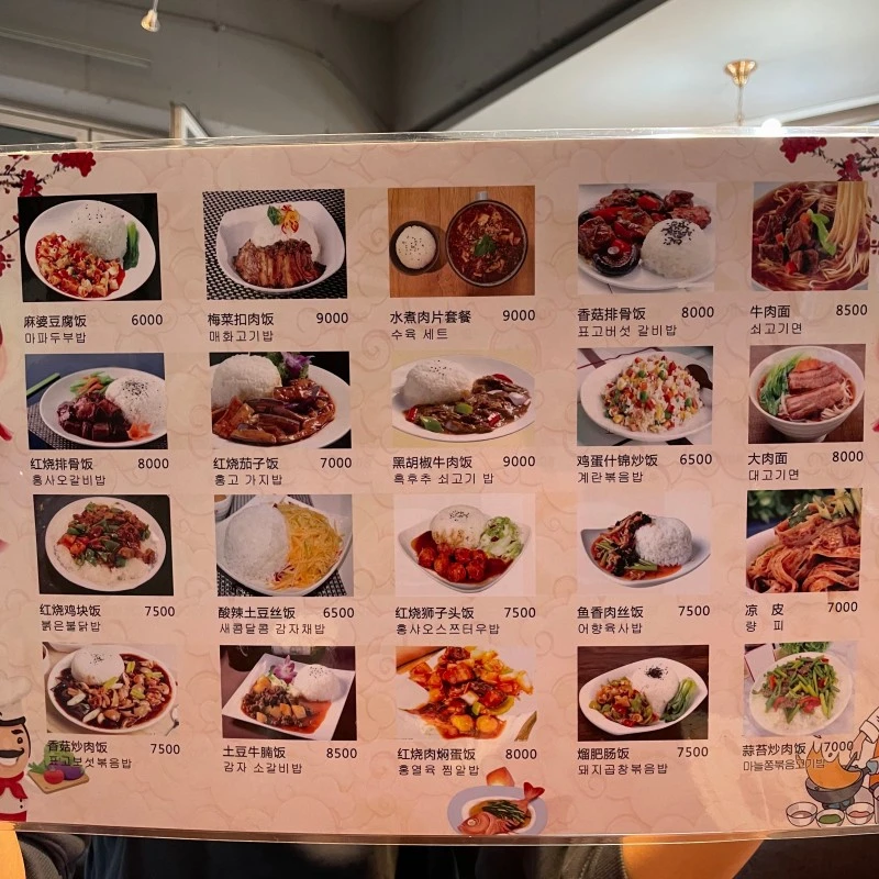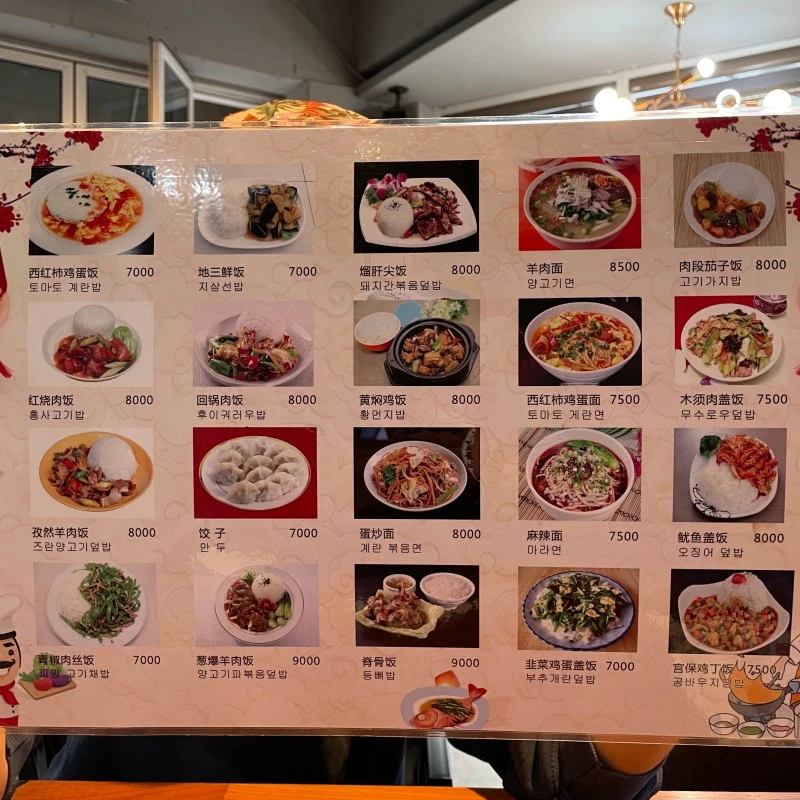 식당에 도착을 하니 중국인으로 보이는 손님이 테이블에 앉아 식사를 하고 있었다. 손님은 그 사람들과 우리 둘이 다였다. 입소문이 아직 퍼지지 않아서 그런가? 아니면 한국의 반중 감정이 한몫 하여 방문하는 손님이 적은가? 측은지심이 들었다. 맛있는 음식을 많은 사람들이 즐기지 못하는 식당의 현실에 아쉬운 감정을 한꼬집정도 느꼈다. 아쉬운 감정을 뒤로하고 메뉴판을 스캔하였다. 50여가지 다양한 메뉴라니. 선택 장애가 있는 사람들은 선택의 기로에 선채로 정말 혼란스러울 것 같다. 한가지 주의점은 이 식당에서는 현지 중국음식을 제공하기 때문에 한국화 된 짬뽕이나 짜장면은 판매하지 않는다.