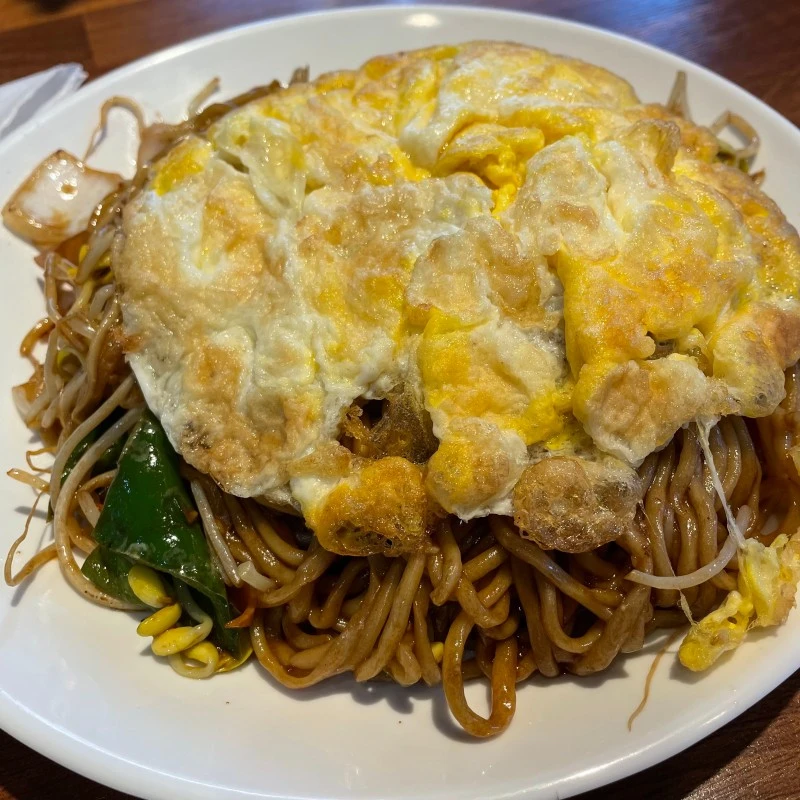 어향가지를 충분히 즐기고 있을 즈음 내가 주문한 계란볶음면이 나왔다. 마찬가지로 조리 직후여서 음식에서 뜨거운 열기가 느껴졌다. 면이 잘 볶아져 거뭇해진 모습을 보자마자 먹지도 않았는데 만족감을 느꼈다. 미국영화를 보고 내가 머릿속으로 생각하고 원하던 딱 그 비주얼이었다. 보기만 해도 이미 맛이 예상되었다. 복숭아씨는 왠지모르게 콩나물을 먹고 싶었는데, 우연하게도 볶음면에 콩나물이 들어있어서 좋아하셨다. 볶음면을 살포시 덮고있는 계란이 갈색으로 그을려져있어 너무 익은 게 아닌가 걱정했지만 젓가락을 갖다 대니 힘을 주는 대로 계란이 쉽게 찢어졌다. 찢어진 계란 조각과 면을 함께 입안으로 넣었다. 면은 강한 불에 볶아서 그런지 수분기가 없어 약간 퍽퍽하였다. 그런 퍽퍽한 부분을 촉촉하고 부드러운 계란이 잘 잡아 주었다. 기름기가 다소 많아 먹다 보면 입안이 느끼해져서 김치 생각이 나지만 함께 볶아졌지만 아직 수분을 머금은 채소들과 함께 먹으니 느끼함은 어느 정도 사라졌다. 중요한 것은 간장베이스의 양념에서 살짝 꾸릿꾸릿한 장맛이 은은하게 느껴졌다. 그 풍미가 그득하게 짭쪼름한 맛이 침샘을 자극하여 입안을 보다 풍부하게 만들어 주었는데 그것이 필자에겐 일품이었다.