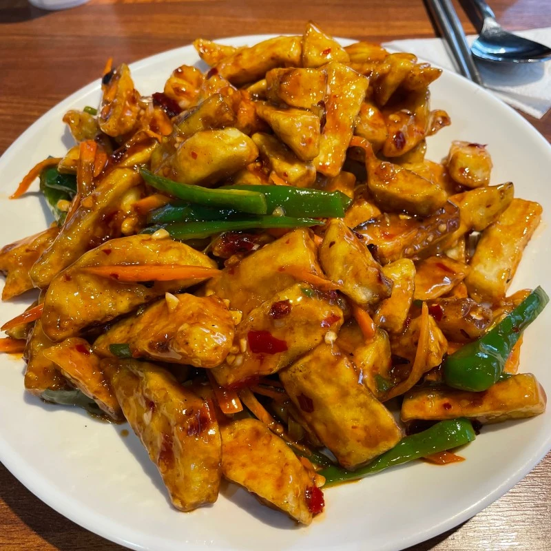 사장님께서 주방에서 조리하는 즉시 본인이 서빙을 해 주셨다. 가장 먼저 나온 음식은 어향가지였다. 갓 만든 어향가지는 김이 모락모락 풍기는것이 어향이 마치 눈으로 보이는 것만 같았다. 그러한 맛깔스러운 비주얼에 젓가락이 무의식적으로 저절로 향했다. 어향소스의 향은 식욕을 자극하는 중화요리의 고소하면서 살짝 매콤한 향이 주로 났지만 깐풍기같은 음식에서 살짝 느낄 수 있는 코를 찌르는 시큼한 향은 전혀 없었다. 입안에 넣으니 처음 0.5초는 바삭한 겉면이 식감이 느껴졌고, 그 후 순식간에 속의 부드럽고 몽글한 가지의 식감이 입안을 가득 채웠다. 맛이 자극적이지 않아서 좋았다. 난생 처음 맛본 어향소스는 간장베이스의 간간하게 짭조롬한 맛이 60% 기름의 고소한 맛 30% 정도로 잘 어우러졌고 나머지 10%는 한국고추와 태국고추가 심심하지 않게 적절하게 커버해 주었다. 필자의 미각으로는 어향소스는 한국의 다진 양념에서 다진 파와 마늘을 뺀 듯한 느낌이 들었다. 그래서 그런지 알싸하고 매운맛이 강하지 않아 부담스럽지 않게 속 편안히 즐길 수 있었다. 기름에 가지가 충분히 튀겨져 나온 모습을 보니 고구마 맛탕이 생각났는데, 그 기대에 부흥하듯 중간중간 히든카드로 달콤한 고구마가 몇 개 정도 있으면 먹는데 재미가 있을 것 같다는 장난스러운 생각이 들었다.