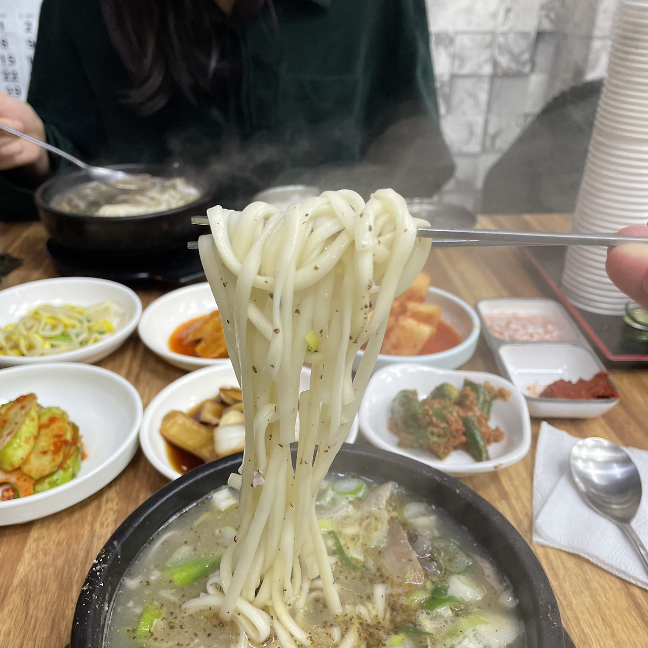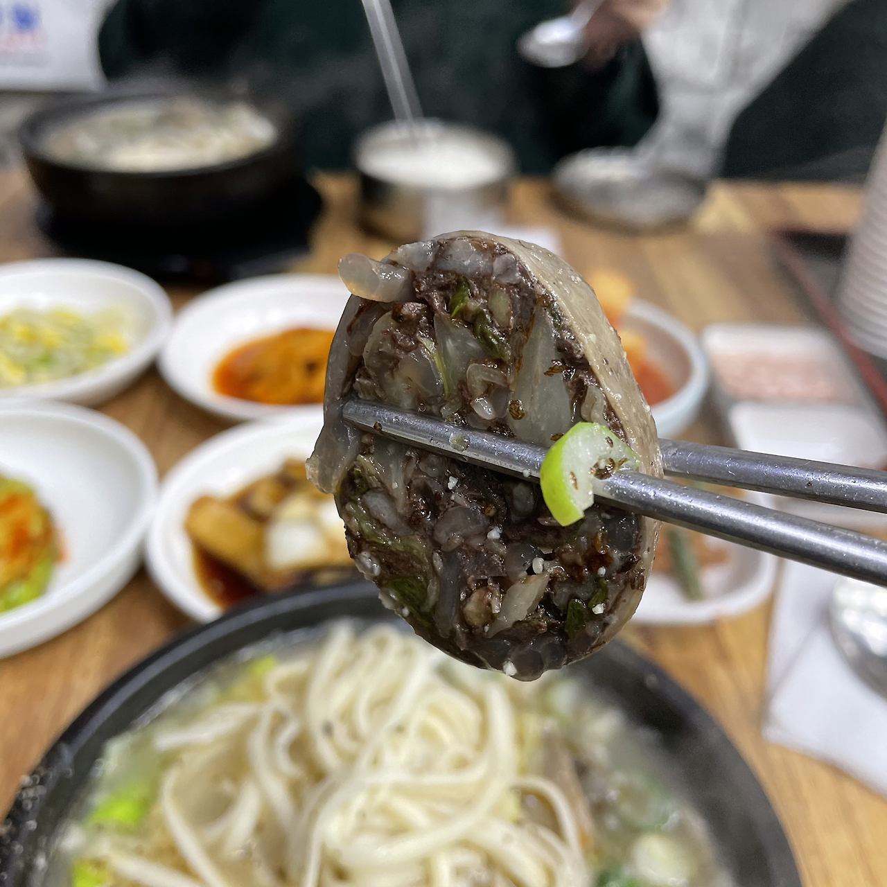 아기다리 고기다리 던 순대국밥이 보글보글 끓으며 우리 앞으로 나왔다. 끓는 모습은 보기만 해도 마음이 후끈해졌다. 식당 벽면의 안내문에는 "후추, 면, 들깨가 기본으로 들어있으니 기호에 맞지 않는 손님은 넣지 말라고 따로 말씀해 주세요"라고 쓰여 있었는데 우리는 셋다 좋아해서 주시는대로 먹었다. 이렇게 삼총사가 완전체로 나오니 당연히 면부터 손이 갔다. 순댓국에 칼국수 면이라니 황당하기도 했는데 한편으로는 노동에 허기진 분들의 배를 충분히 채워주기위한 주인장의 따뜻한 마음씨가 담겨 있는 것 같아 감동을 받았다. 후루룩 면치기를 시전 해보니 특별한 면은 아니고 설렁탕에 소면이 들어가는 것처럼 단순히 포만감을 위한 면인 것 같았다. 적당한 양의 식사를 원하시는 분이라면 면은 따로 추가하지 않아도 될 것 같다. 다음으로 곧바로 이 집의 하이라이트인 순대를 맛보았다. 보기에도 일반 찰순대가 아닌 순대 곱창 껍데기에 갖은 재료들을 가득 넣어 만든 순대였다. 한입에 넣기 부담스러울 정도의 크기였는데, 그 맛을 온전히 즐기고 싶어서 한입에 넣고 우걱우걱 씹어보았다. 처음 씹을 때는 '아 이거 내가 못 먹는 순대다'라는 생각이 잠시 들었다. '[충북 보은] 김천식당'편에서 그 이유에 대해 설명하였는데, 돼지 냄새가 심하게 나는 피순대는 필자는 잘 먹지 못한다. 처음 씹을 때 그 돼지 냄새가 날 것 같아서 순간적으로 아차 싶었는데 계속 씹으니 역한 냄새가 나지 않아서 정말 다행이라고 생각했다. 하지만 씹으면 씹을수록 무언가 입속에 화~한 느낌이 점점 올라왔다. 필자가 느끼기엔 경상도에서 보신탕이나 추어탕을 먹을 때 필수적으로 넣어먹는 산초가루 혹은 제피가루라 불리는 향신료의 향이 강하게 느껴졌다. 정식 이름은 초피나무라고 하는데 이 열매의 껍질을 '제피'라고 한다. 매콤하고 톡 쏘는 향이 특징이어서 주로 역한 냄새를 잡는 역할로 자주 사용된다. 필자는 제피가루를 좋아하는 편이어서 괜찮았는데 문제는 그 세기가 생각보다 강했다. 역류성 식도염 환자가 먹으면 안 되겠는데?라는 생각이 들 정도로 순대와 국물을 계속 먹다 보니 목 깊숙이 화~한 느낌이 강하게 들어 나도 모르게 이마에 땀이 송골송골 맺혔다. 고기는 깔끔한 돼지 살코기가 주를 이루었는데 먹었을 때 지극히 평범한 돼지 냄새가 나서 잡내를 잡기 위한 특별한 레시피를 쓰시진 않았구나 생각 들었다. 보아하니 옆 테이블에서는 허양만백반기행 세트를 주문해서 찜기에 후끈하게 올라온 왕순대를 먹으셨는데, 주인분이 그 손님들에게 설명해주길 김에 순대와 나물장아찌를 잘 싸서 먹으면 맛있다고 하셨다. 우리에게 나물장아찌는 없었지만 김이 있었기 때문에 나도 한번 그렇게 싸 먹어보았는데 확실히 김의 고소한 맛이 순대의 센 향을 어느 정도 잡아주었다. 확실히 호불호가 갈릴 순대의 맛이었다. 시장이 반찬이었기 때문에 둘다 맛있게 다 먹고 서둘러 자리를 일어섰다. 이유인즉슨 고된 일상에서 소주 한잔 기울이며 즐거운 한때를 보내시는 아재들의 들뜬 목소리는 상상 그 이상으로 시끄러웠다. "그게아이고!!마따마따&#^..."