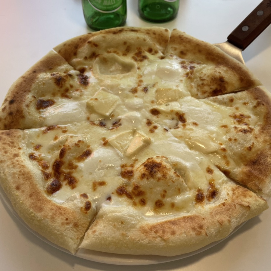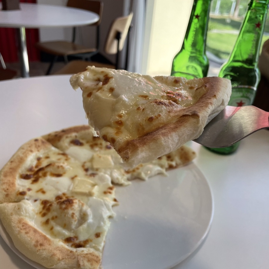 피자를 한 조각 들어 올릴 때 치즈가 흐르듯 많지는 않아서 약간은 실망했지만 고소한 향기가 예술이었다. 한입 먹어보니 도우는 꽤나 얇았고 화덕에 구워져서 그런지 따뜻함을 가지고 있는 잘 만들어진 빵 같았다. 치즈에 대해서 가지고 있는 지식이 얕아 어떤 치즈가 4종류 올라가 있는지 몰랐지만 �씨에게 물어보고 글을 수정해야겠다.