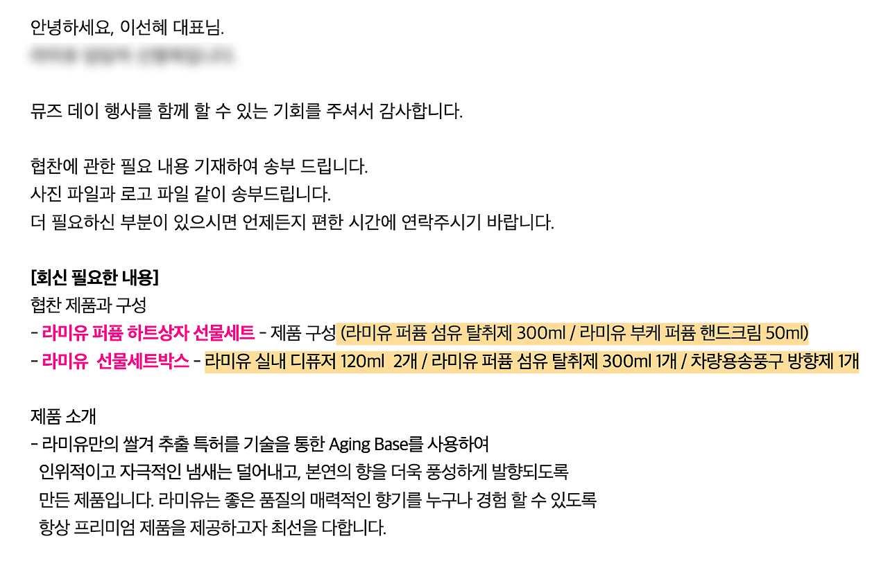 뮤즈데이 시즌2 협찬사로 참여한 라미유 담당자님과의 메일 일부입니다.