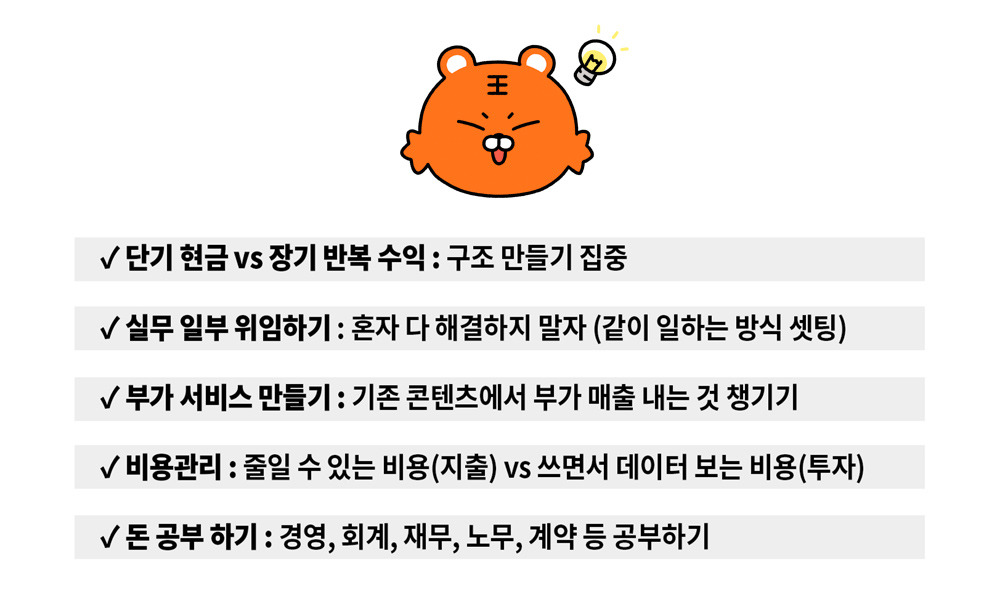 마지막으로 '자금관리'를 잘해야 해요. 언제든 위험에 빠질 수 있고, 마음대로 되지 않는 순간이 찾아오기 때문에 비용관리를 잘하는 것은 필수예요. 뿐만 아니라 세금공부를 해야 해요. 비용도 수익도 모두 올라가는 시기인 만큼, 돈공부를 소홀히 하지 말아야 해요.