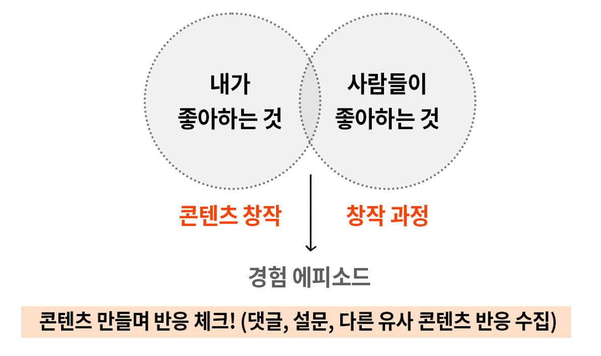 내가 좋아하고, 잘하는 것에서 시작하세요. 그리고 사람들이 좋아하는 것 사이 '교집합'에서 콘텐츠 소재를 발굴하는 거예요. 콘텐츠를 소비하는 사람들에게 어떤 효용을 줄 수 있을지 고민해 보세요. 정보성 / 재미 어느 쪽이더라도 공유할 만큼 가치 있으면 되니까요!