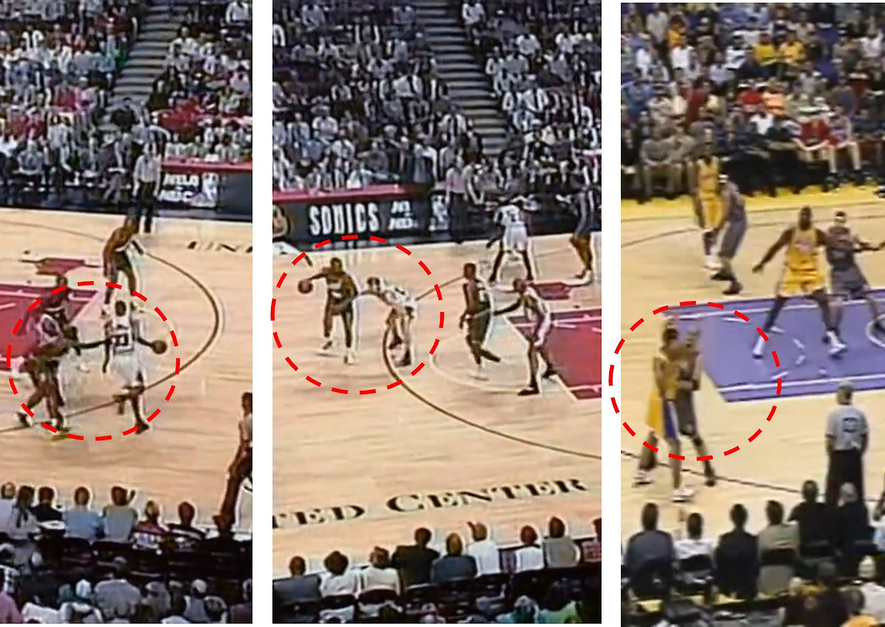 * 특히, 르브론의 위치와 맨 위 사진의 코비 위치의 수비수 간격은 매우 상징적입니다. (물론, triple threat 포지션의 공격수에 대한 대처 부분에 대한 이슈는 별개로 합니다. 사실 이 점도 핸드체킹에 대한 금지 이슈와 밀접하긴 합니다)