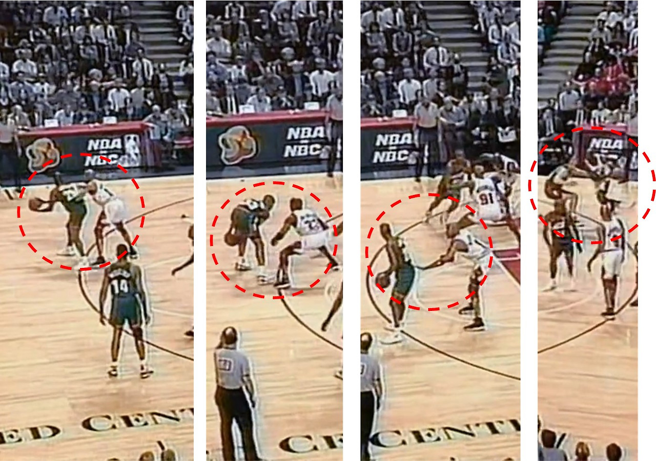 * 사진 속 공격수는 당시 최고 수준의 퍼리미터 공격/수비를 자랑하던 게리페이튼과 마이클 조던, 스카티 피펜입니다. (해당 선수의 운동능력이나 슛 셀랙션이 제한적이라서 그렇다는 논쟁은 없을 것입니다)