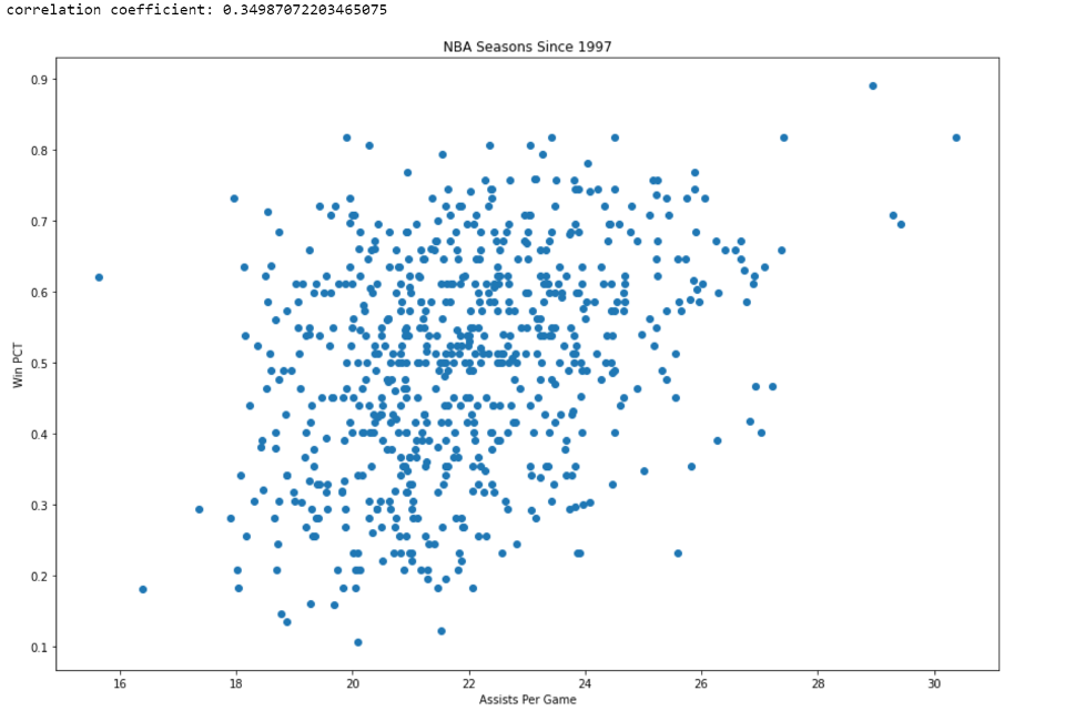 재미있는 그림이 하나 있어서 소개해 봅니다. 97년 이후, 1경기 어시스트 절대 개수와 승리의 상관관계를 나타낸 것입니다. 상관계수가 0.5를 넘지 않는 상대적으로 다소 약한 상관계수를 보여줍니다. 즉, 어시스트를 아무리 많이 하더라도 질 팀은 지고, 적게 하더라도 이길 팀은 이겼다는 점이죠. (예를 들어 휴스턴로케츠의 털보 하든을 떠올려 보시면 좋습니다. 극단적 아이솔레이션 3점과 골밑 공략 만으로 정규시즌 많은 승수를 쌓았습니다)