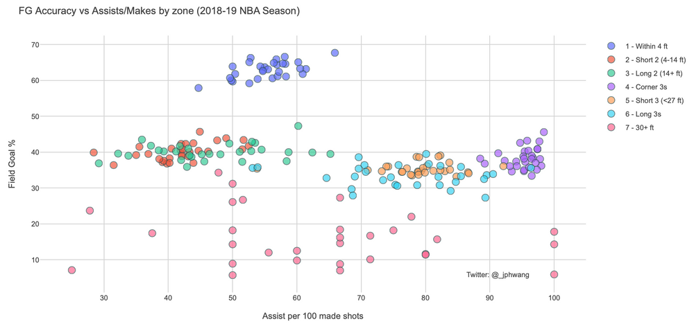 위 그림은 18~19 시즌의 슛거리별 어시스트와 필드골 성공률의 상관관계입니다. 제 예상대로 림과 가까운 4ft 이내는 유의미한 상관관계를 추정할 수 있으나, 림과 멀어질수록 특히 3점 슛의 영역(중단의 주황색/하늘색 3점 슛, 하단의 핑크색 로고 샷 등)으로 갈수록 전혀 상관관계가 보이지 않습니다.