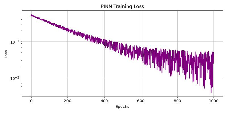Loss는 최초 1회의 학습에는 0.5273로 매우 높았지만 1000번을 학습하는 과정에 0.0189로 줄어들었습니다. 아래의 그래프를 보면 진폭이 커지면서 Loss가 지속적으로 우하향(Loss감소)하는 것을 볼 수 있습니다. PINN이라는 모델이 여타 경쟁모델들로는 수렴하기 어려운 비선형 곡선에서 탁월한 안정감을 보인다는 것을 증명하고 있습니다.