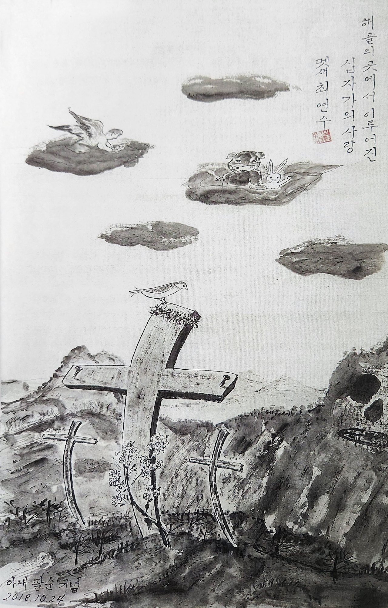 ‘해골 곳’이라는 으스스한 골고다 언덕에 십자가가 서있다. 다른 것과는 달리 머리에 가시 冕旒冠(면류관)을 쓰고 말이다. 그리고 녹슨 못이 아직도 박혀 있다. 풀 한 포기 자랄 수 없는 瘠薄(척박)한 땅, 이 십자가에 기대어 한 그루 나무가 자라고 있다. 오얏나무다. 素服(소복)처럼 하얀 꽃이 피어있다. 그리고 주검을 찾아다닌다는 까마귀 한 마리 얼씬하지 않은 이 곳 십자가 위에 동그마니 앉아 있는 새 한 마리! 꽁지가 짧은 걸 보니 멧새다. 친구커녕 먹이조차 얻을 수 없는 이 곳에....