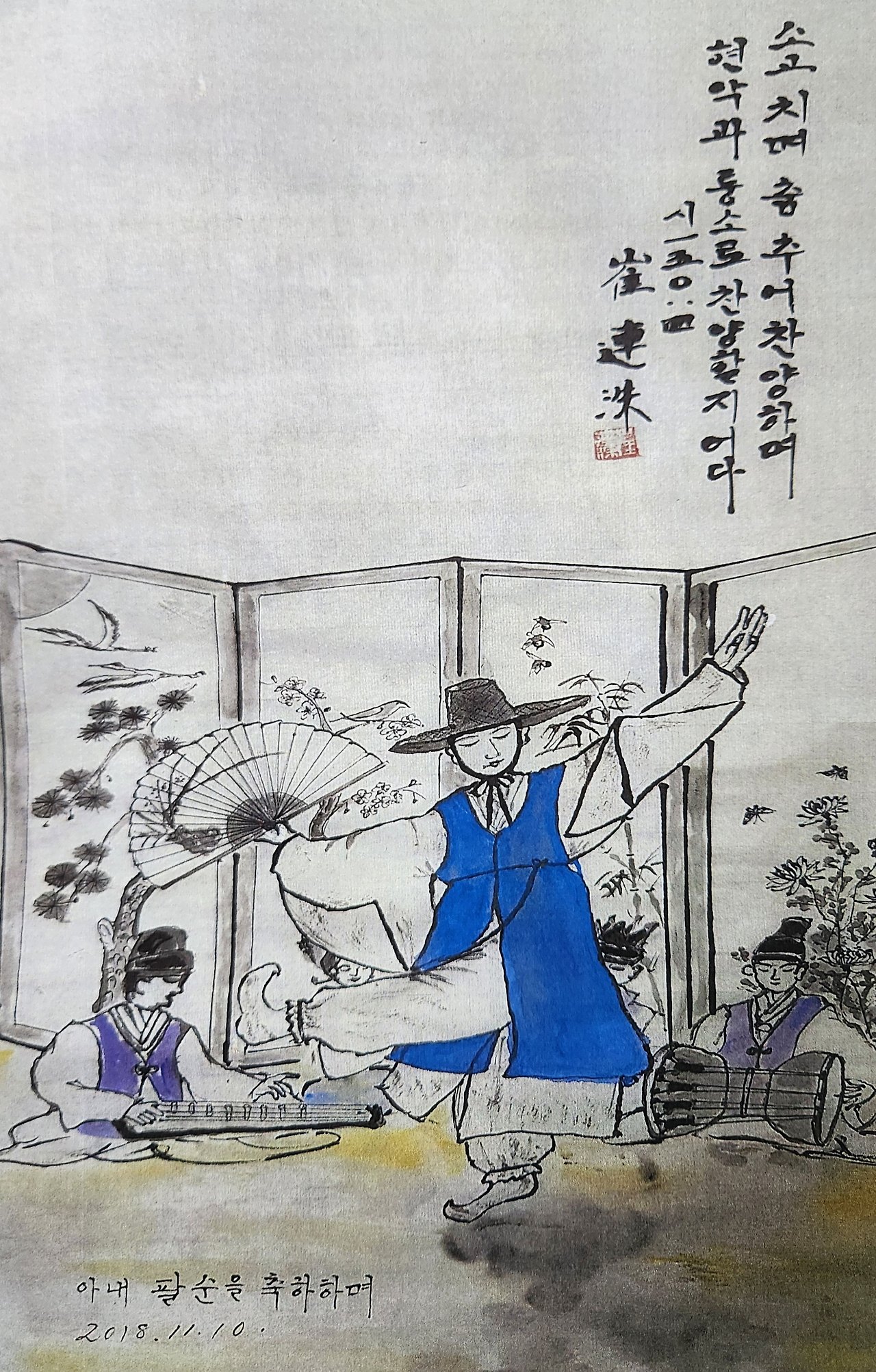 자녀들이 마련한 내 팔순 잔치 때, 이렇게 말했다. 우스갯소리로 알고 귀담아 듣는 사람은 없는 것 같았다. 궁궐 안에서도 잔치가 벌어지면, 임금님 앞에서 舞姬(무희)들이 춤을 추었지 않았나? 우리 집 여왕님 앞에서 신하가 춤을 추기로서니 크게 흉될 것 같지 않다. 그러나 무대가 마련되고 風樂(풍악)이 울려야 제격이지, 술도 없는 민숭민숭한 자리에서는 꼭두각시 춤만도 못할 것이다. 그래서 그림으로 代替(대체)하기로.
