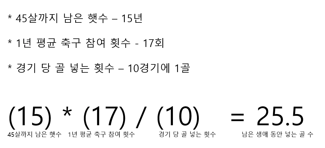 축구는 체력 소모가 심한 운동이다. 나이가 들면서 자연스레 멀어지게 되는 취미이다. 전에 동네 어른들과 조기축구회를 잠깐 했을 때에도, 45세 이상인 분은 한 명도 없었다. 전에는 이런 게 남의 일 같았는데, 서른이 두달만 남은 지금은 그렇지가 않다. 나는 1년 52주 중 1/3 번 정도는 축구를 하고 있다. 그리고 개발이라서.. 5경기 중 1번 정도 골을 넣는다. 이걸 45살까지 무탈하게 꽉 채워서 한다고 쳐도, 앞으로 살면서 넣을 수 있는 골 수는 25.5골밖에 되지 않는다.