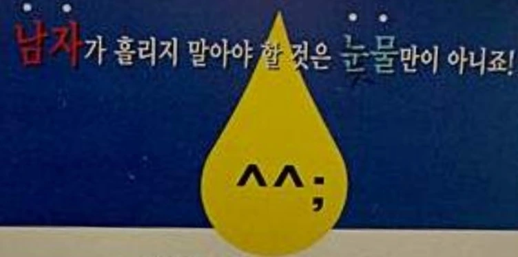 남자 화장실에서만 보게 되는 독특한 문구, '남자가 흘리지 말아야 할 것은 눈물뿐이 아니라며 조심스레 볼 일을 보란다. 한데 이 글귀를 볼 적마다 왜 남자는 눈물을 흘리면 안된다는 경고(?) 아닌 경고가 떡 하니 위협을 하고 있는지 알다가도 모를 일이다.