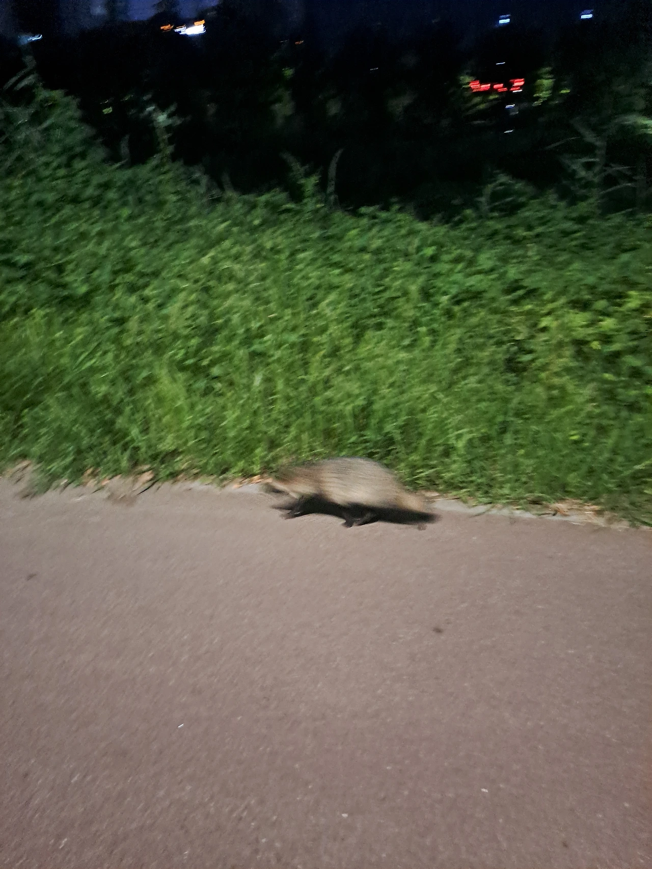 반백년을 더 살고 진 내가 태어나서 처음 너, 너구리를 야생에서 만났으니 말이다. 그것도 도심지 아파트로 밀집된 곳, 그 옆을 흐르는 학의천 산책로 바로 옆에서.
