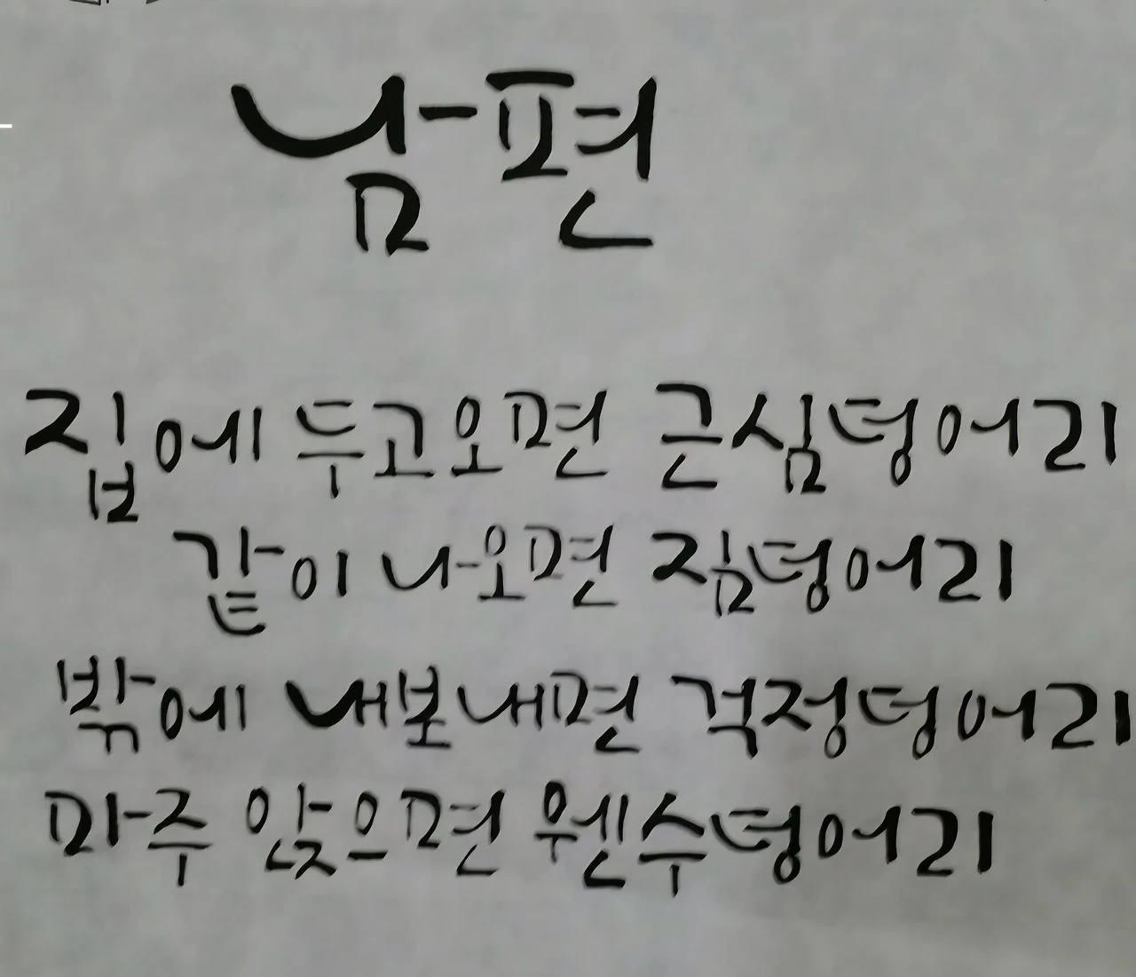 혹시라도 남자를, 아니 남편을 못마땅해하는(?) 이들 논리 아닐까라면서도 움츠려 드는 것까지 숨길 순 없다. 괜히 긁어 부스럼 만드는 것 같기도 하고. 심사가 여간 복잡한 게 아니다.