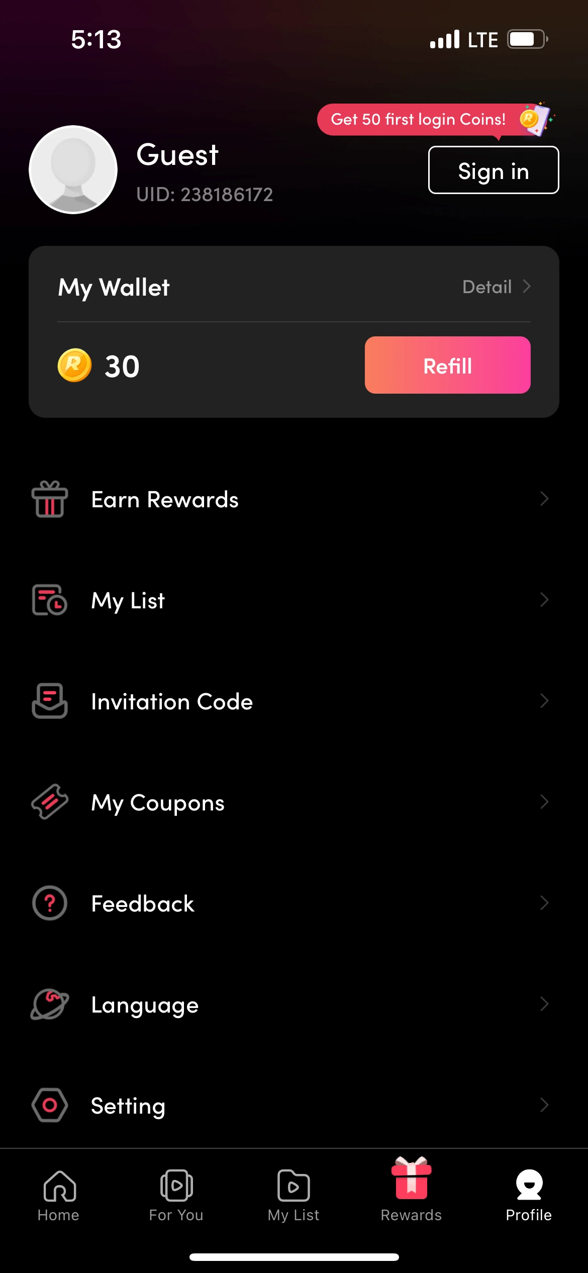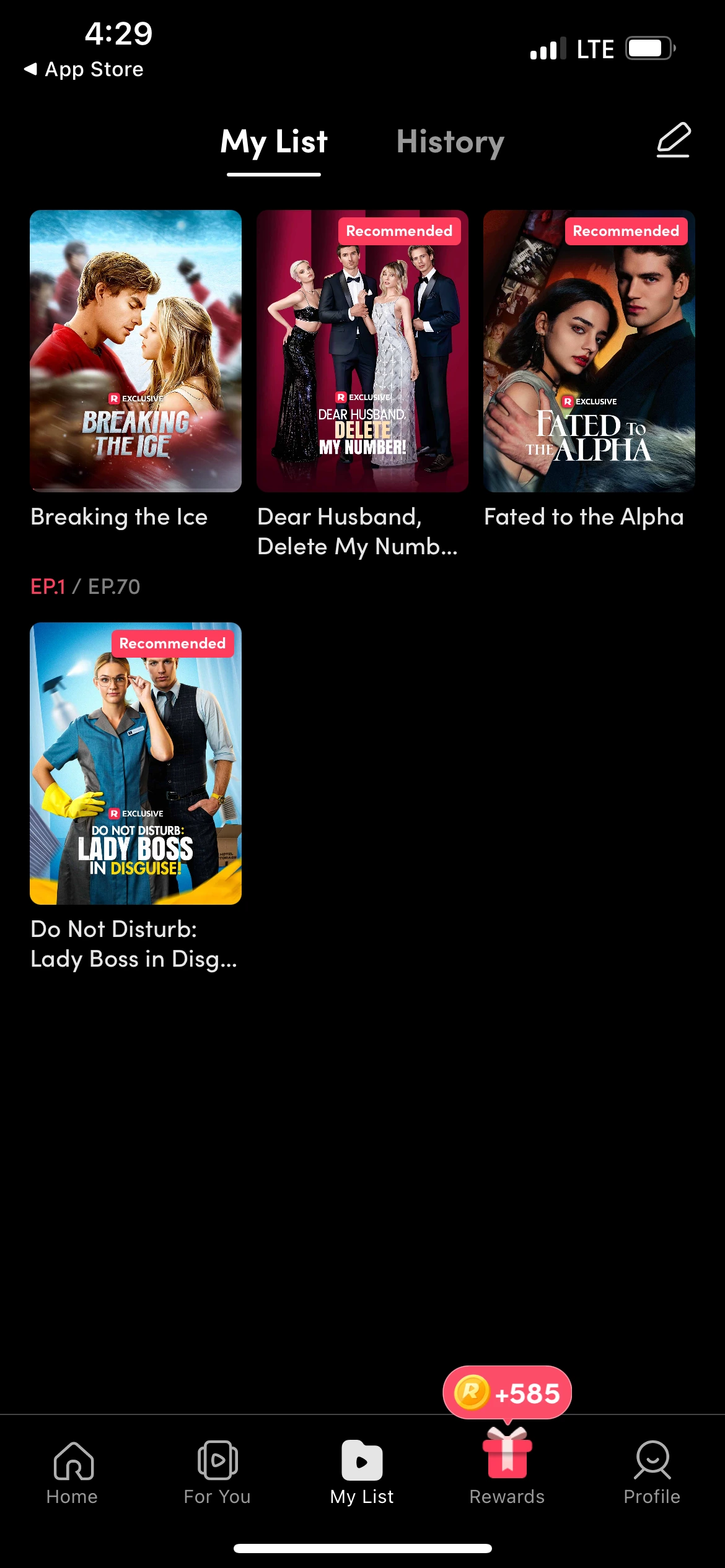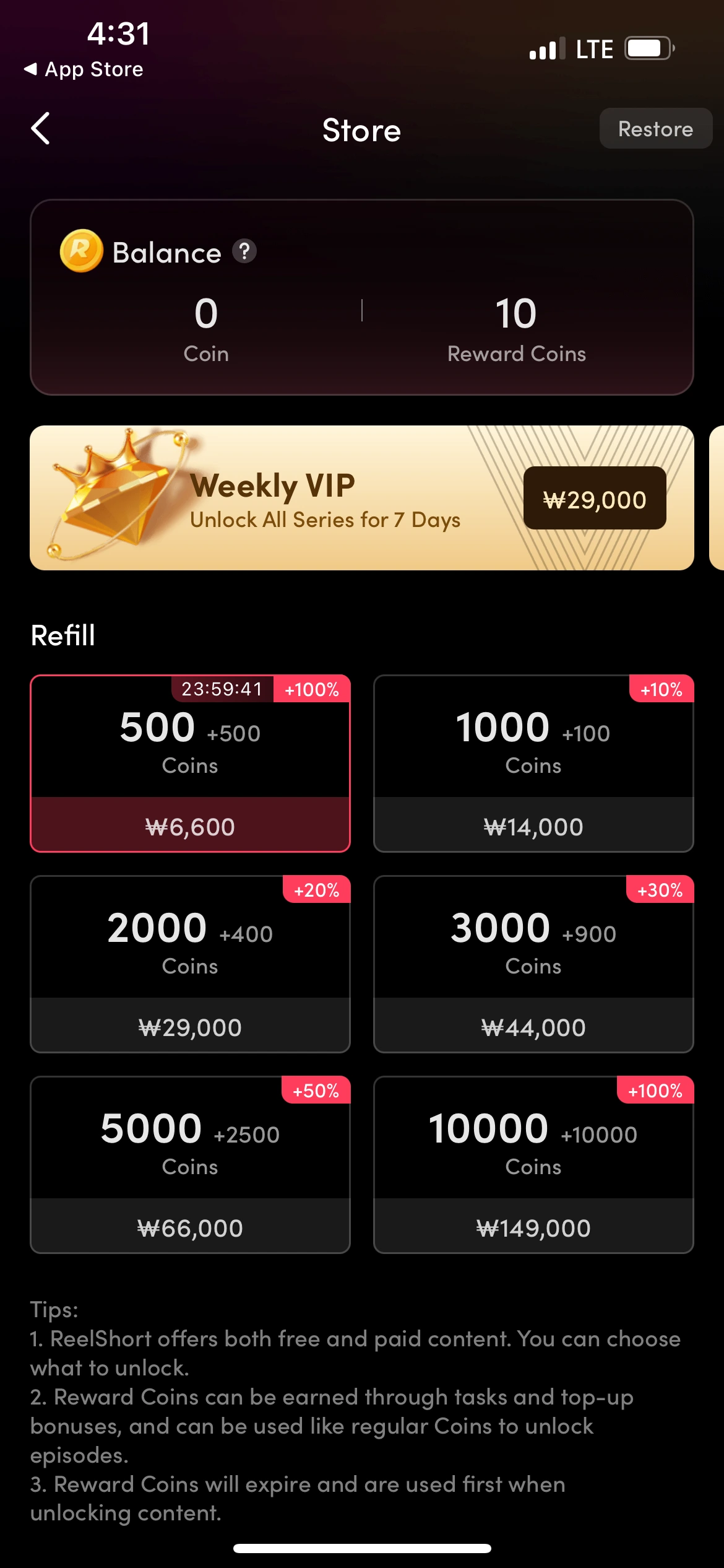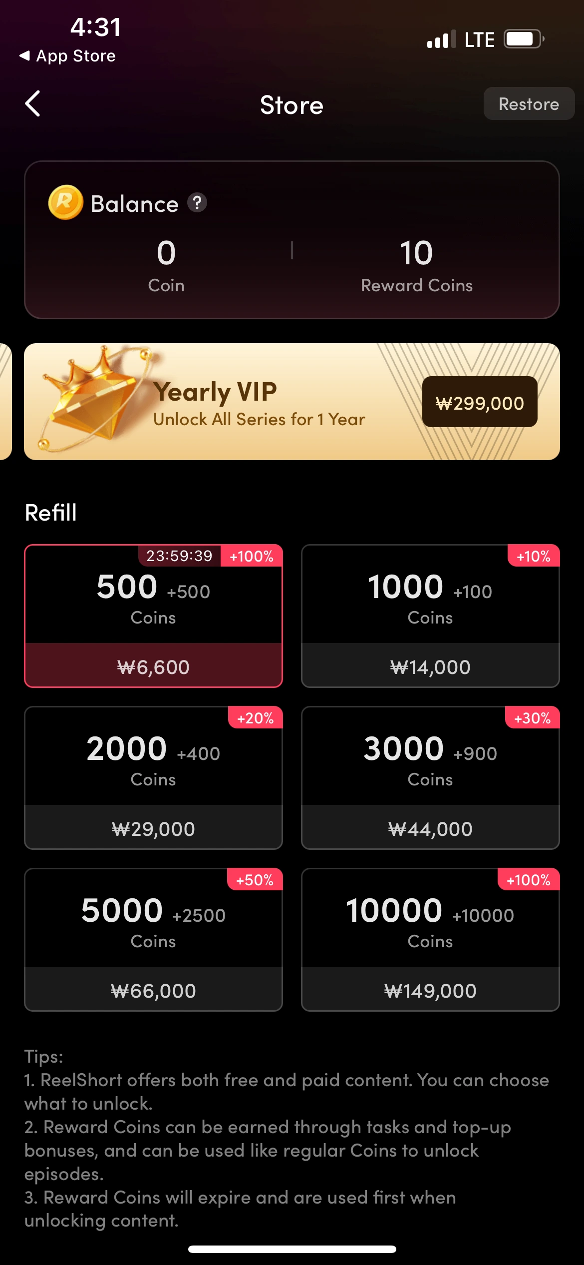 프로필에서 주목할 부분은 코인이 노출되는 부분인데요. 일반적인 OTT 서비스는 구독제를 활용하는 반면에, 릴숏은 네이버 웹툰과 비슷하게 단건 결제를 통한 소비 모델을 사용하고 있어서 해당 부분이 주요하게 자리잡고 있는 것 같습니다.