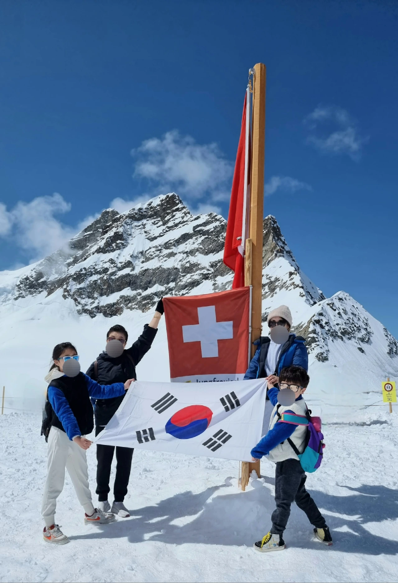 우리는 산악인도 아닌데, 알프산 산 정상에서 태극기를 들고 사진을 찍도록 해 주셨다.(감사)
