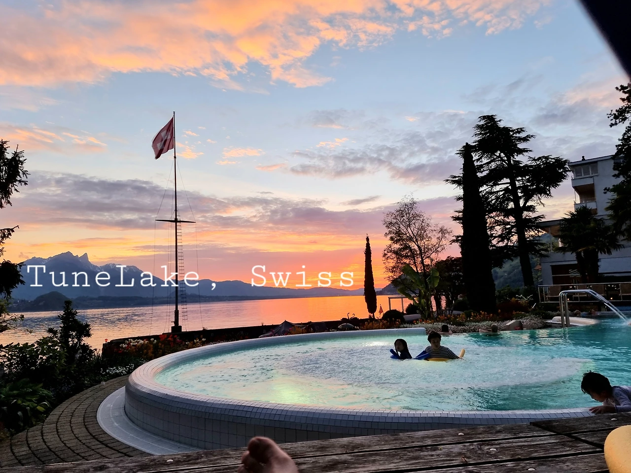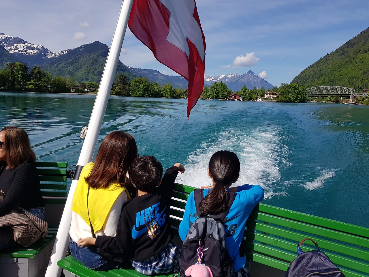 튠 호수는 고요하고 맑았다. 빙하기를 거쳐온 알프스 영봉의 눈 덮인 산 아래의 호수는 푸른빛을 더했다. 스위스 국기를 단 유람선은 선착장에서 우리를 태우고, 호수 위를 가르며 지났다.