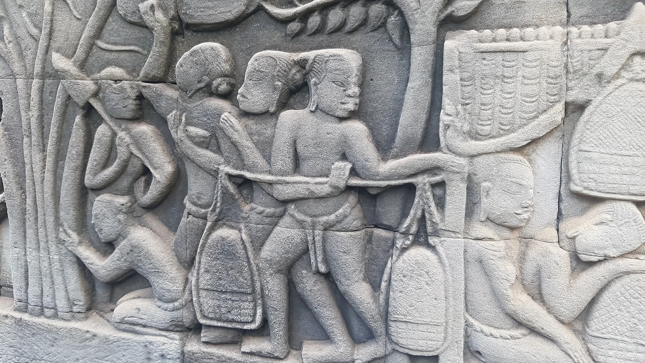 사원 내부에 크메르 제국의 역사와 생활상이 그려져 있다. 회랑의 물고기, 악어, 배, 참파군 등 전쟁의 모습까지 묘사되어 있다.