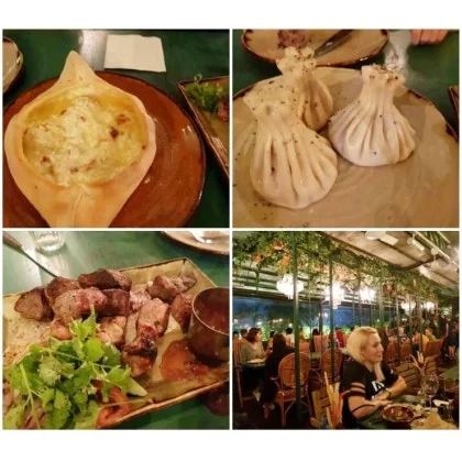 양고기 샤슬릭, 힝깔리 만두, 아자르식하차푸리, 고르곤졸라피자 암튼 이름들이 참 길다. 골고루 인기라 해서 시켰는데 양고기는 약간 냄새가 났고 질겼다. 대체로 먹을만했다. 직원들은 매우 친철했다. 생일 있는 사람은 축하도 열어주고. 우리 테이블에 와서도 손자에게 호감을 보였다.