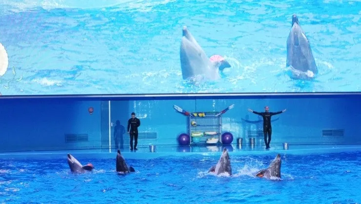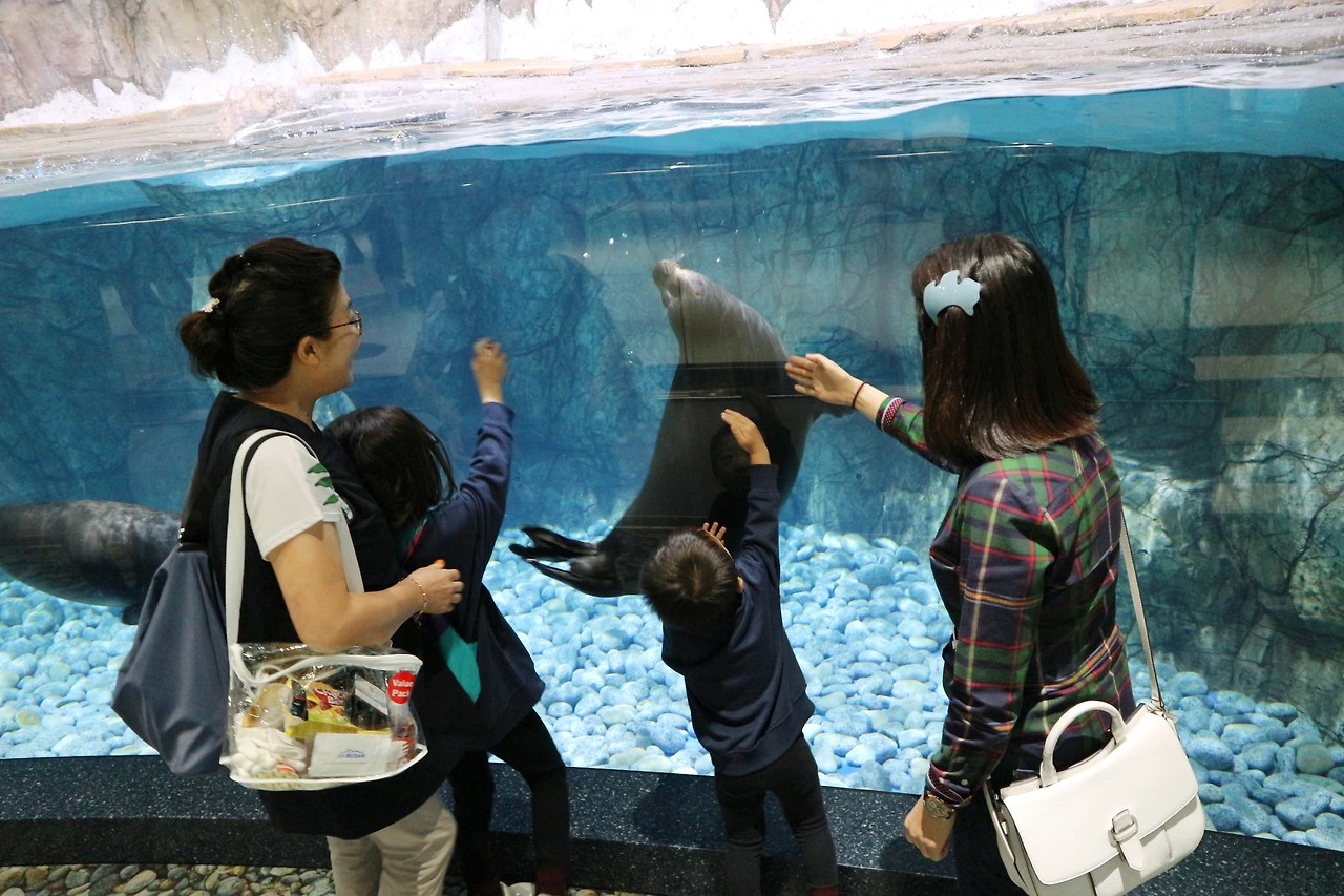 바다의 생물들이 많이 와 있다. 바다사자, 상어, 가오리, 고래 등에 눈길이 간다. 수족관의 내부가 깊은 심해 바다 같았다. 돌고래가 손주들에게 인사한다. 우리는 지정된 좌석에 앉았다.