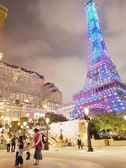 호텔로 돌아왔다. 다시 손주들을 위한 키즈 카페로 고고, 더 파리지엥 호텔 앞쪽 야외공간은 대낮처럼 화려한 불빛과 음악이 쏟아져 내렸다. 이곳은 파리 테마의 대형 카지노 리조트로 미니 에펠탑이 랜드마크였다. 손주들과 손잡고 흥겹게 놀았다.