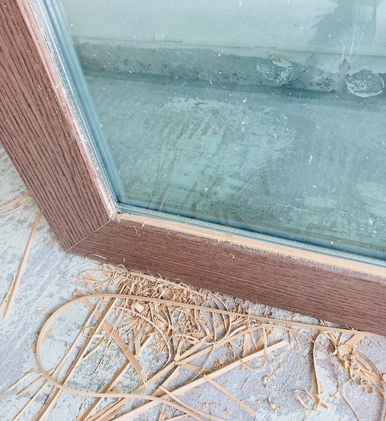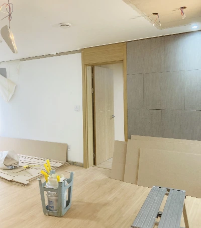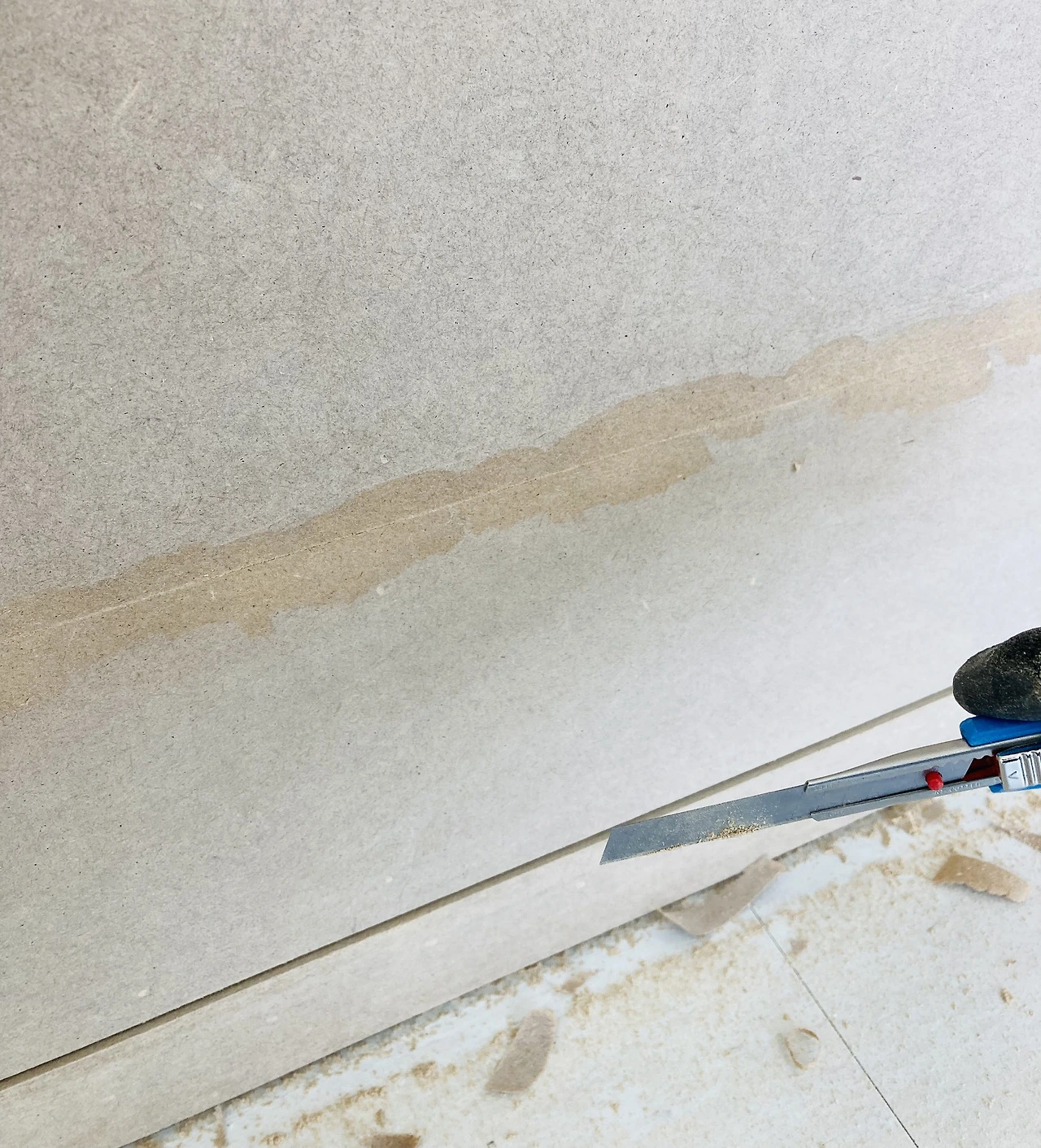나무조직을 압착하여 만든 MDF(합판)의 경우, 아무리 깨끗하게 붙인다 한들 이음새 부분에 단차가 생기기 마련이다. 이러한 단차를 제거하여 필름을 붙였을 때 단차가 보이면 안되니 칼을 사용해 합판의 튀어나온 부분을 깎아주는 작업을 한다. 그 뒤 단차를 더 줄이기 위해 살짝 샌딩을 하고, 들어간 부분을 일정하게 채워주기 위해 퍼티작업을 한다. 퍼티가 다 마른 뒤 다시한번 샌딩을 통해 단차를 완전히 제거한다.