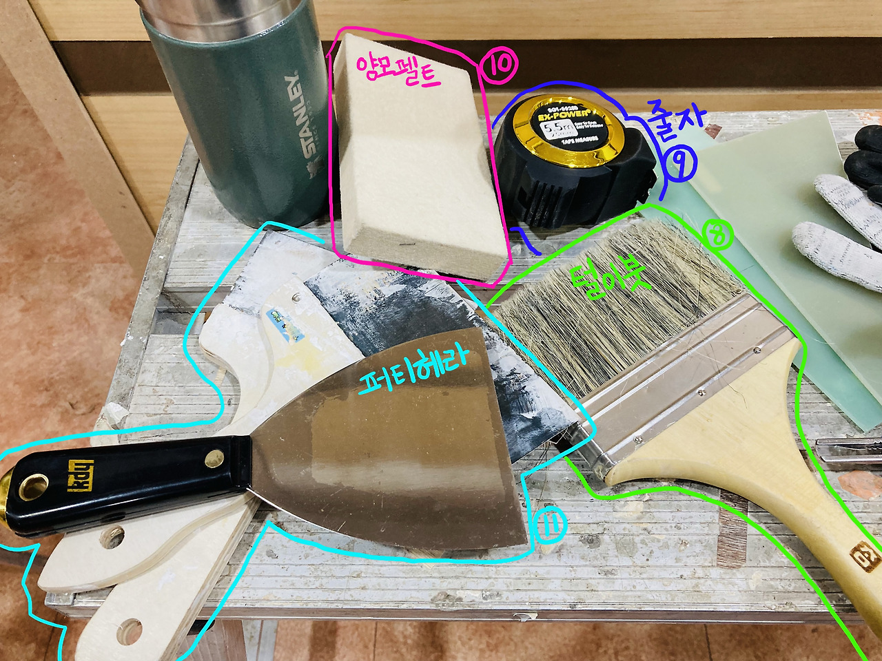 ⑪ 퍼티헤라: 퍼티를 펴발라주기 위해 사용해요. 눌렀을 때 적당히 탄성이 있는 제품이 쓰기 편해요.