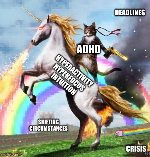 위의 밈처럼 되지 않기 위해 노력했다! 한 가지에 지나치게 몰두해서 그것만 생각하느라 하루를 다 보내는 행위를 그만뒀다! ADHD라는 이유로 ADHD에 과집중하며 온갖 정보를 알아보는 데 하루를 다 쓰지 않고 관심을 적절한 때 끊어냈다! 그럼으로서 그날 해야 할 다른 일들을 다 마칠 수 있었다!