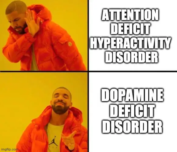 기쁨, 만족, 보상-이런 것과 밀접하게 관련된 화학물질인 도파민과의 상관관계를 언급하지 않을 수 없다. ADHD 환자는 뇌 일부가 다르게 작동하기 때문에 기본적인 뇌내 도파민 레벨이 낮다. 때문에 많은 ADHD 약물이 도파민과 노르에피네프린의 레벨을 올리는 식으로 작동한다. 정확히는 그 신경전달 물질이 시냅스 내에서 오래 머물며 강해지게 만들어 준다. 현대 한국인이라면 누구나 도파민에 중독되기 쉬운 환경에 노출돼 있겠으나, ADHD는 거기에 더해 애초부터 머리 안에서 도파민이 제대로 작용 못 하게 태어났다는 것이다.