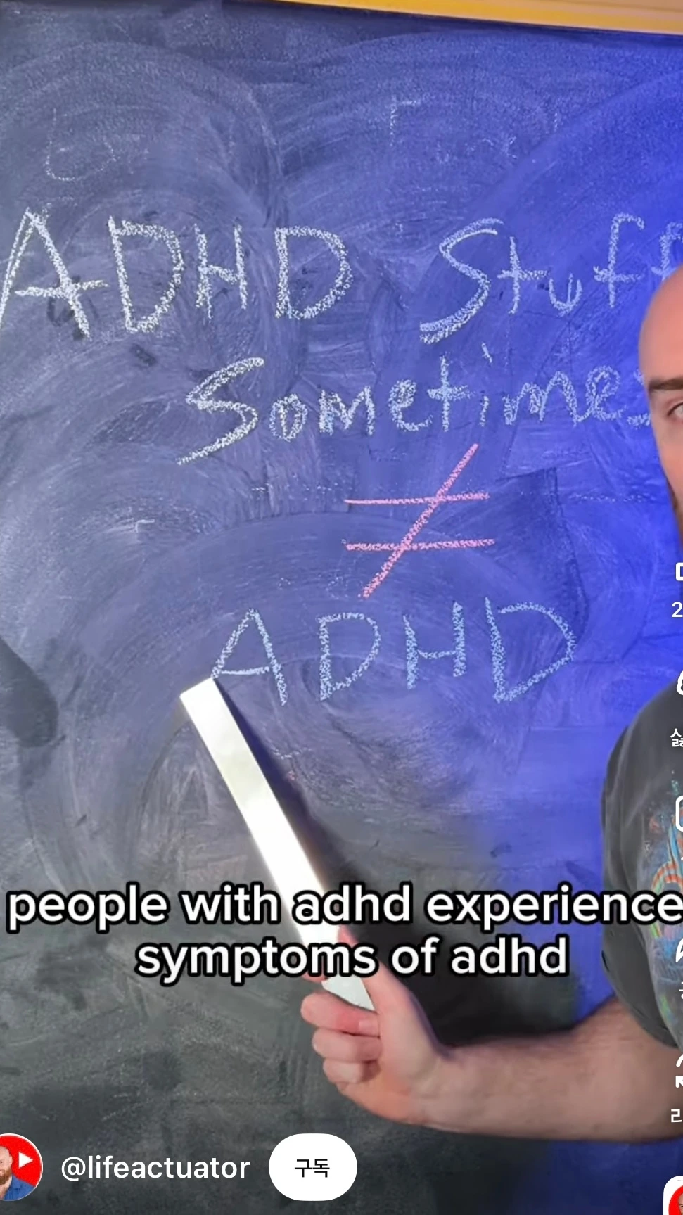 “ADHD의 증상을 경험해 봤다고 하는 사람들이 있다. 그들은 이따금 증상을 겪지만 ADHD인 이들은 항상 겪는다. 당신이 내 영상 중 일부에 공감한다고 해서 ADHD가 있다는 뜻은 아니며 당신이 일부에 공감하지 못한다고 해서 ADHD가 아닌 것도 아니다.”