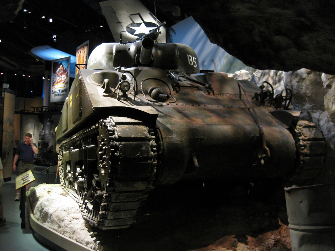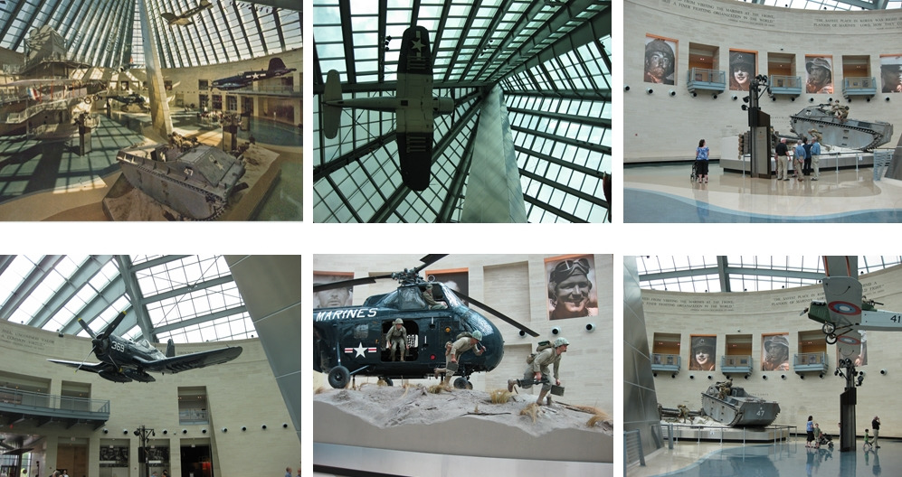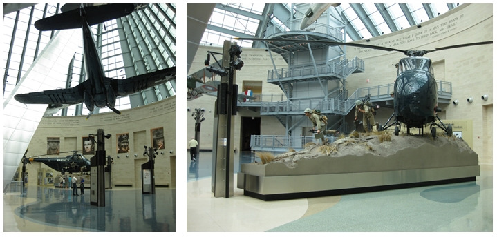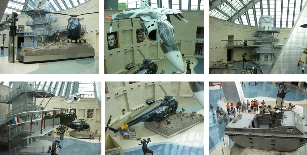이렇게 넓고 높은 층고의 홀에 각종 전쟁에 사용된 군수품이 전시되어 있습니다. 천정에는 1차 세계대전에 사용되었던 복엽기부터 최근의 전투기까지 행잉되어 있으며 홀 바닥 중간중간에는 해병대원들이 상륙하고 침투하는 장면이 아일랜드 타입의 모형으로 연출되어 있습니다.