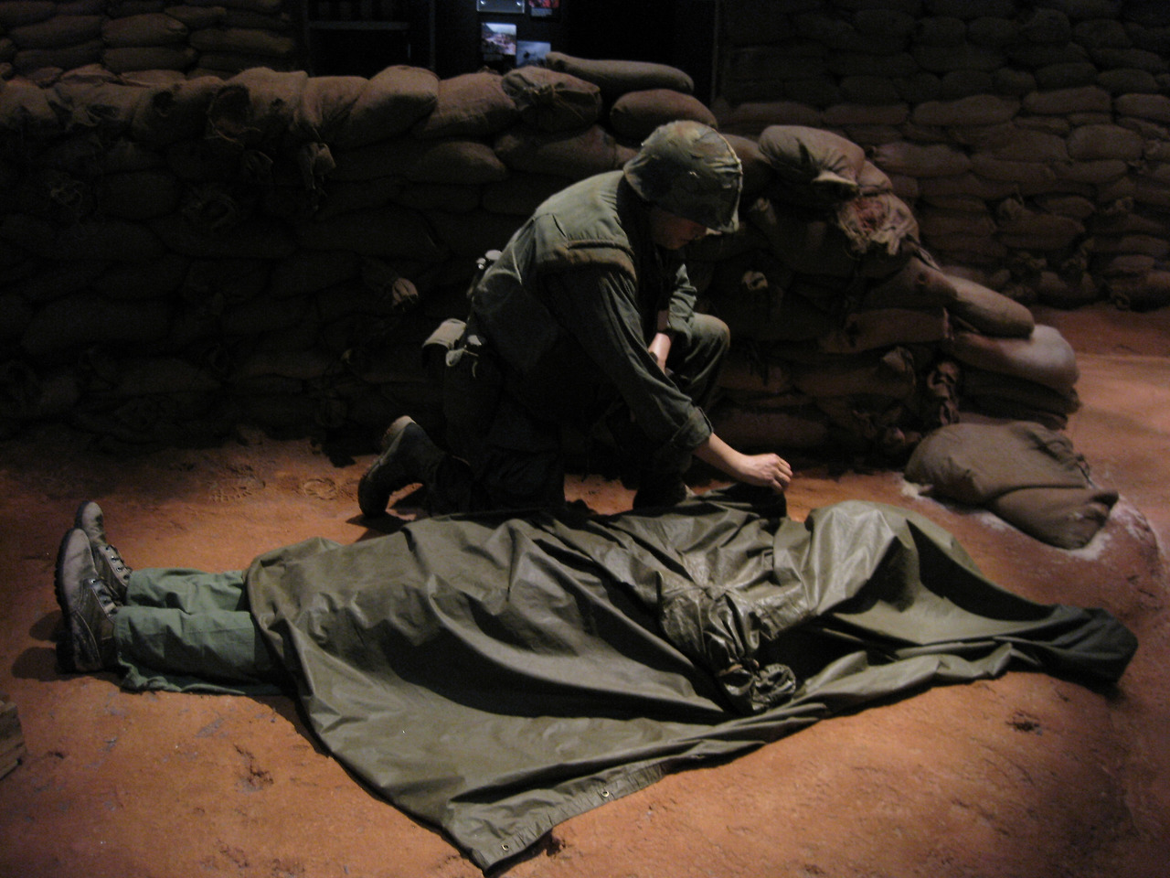 전투 중 전우가 숨진 것 같습니다. 판초우의로 전우의 시신을 덮는 장면을 연출한 전시부스입니다.