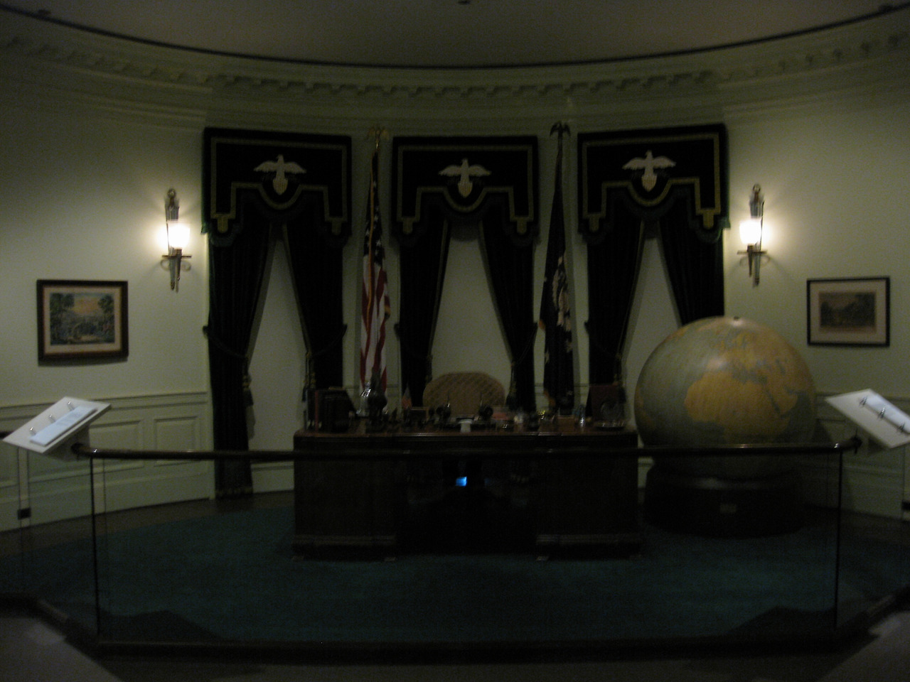 전시실은 주로 루스벨트 대통령과 관련된 사료를 쇼케이스에 전시하고 집무실로 사용했던 책상 등의 집기를 당시 사용했던 가구 그대로 배치해놨습니다. 루스벨트 대통령이 앉아서 집무를 보고 법안에 서명했을 것으로 생각되는 책상이어서 무척 인상이 남았습니다. 우리나라 대통령 전시실을 가면 대통령 집무실을 연출할 시 당시 사진만 참고해서 새로 똑같은 형태의 가구로 만들어서 놓다 보니 감흥이 새롭게 다가오지는 못한 것 같은데, 실제 대통령이 사용했던 가구를 그대로 배치해 놓은 것을 보니 신선하게 느껴지기는 했습니다.